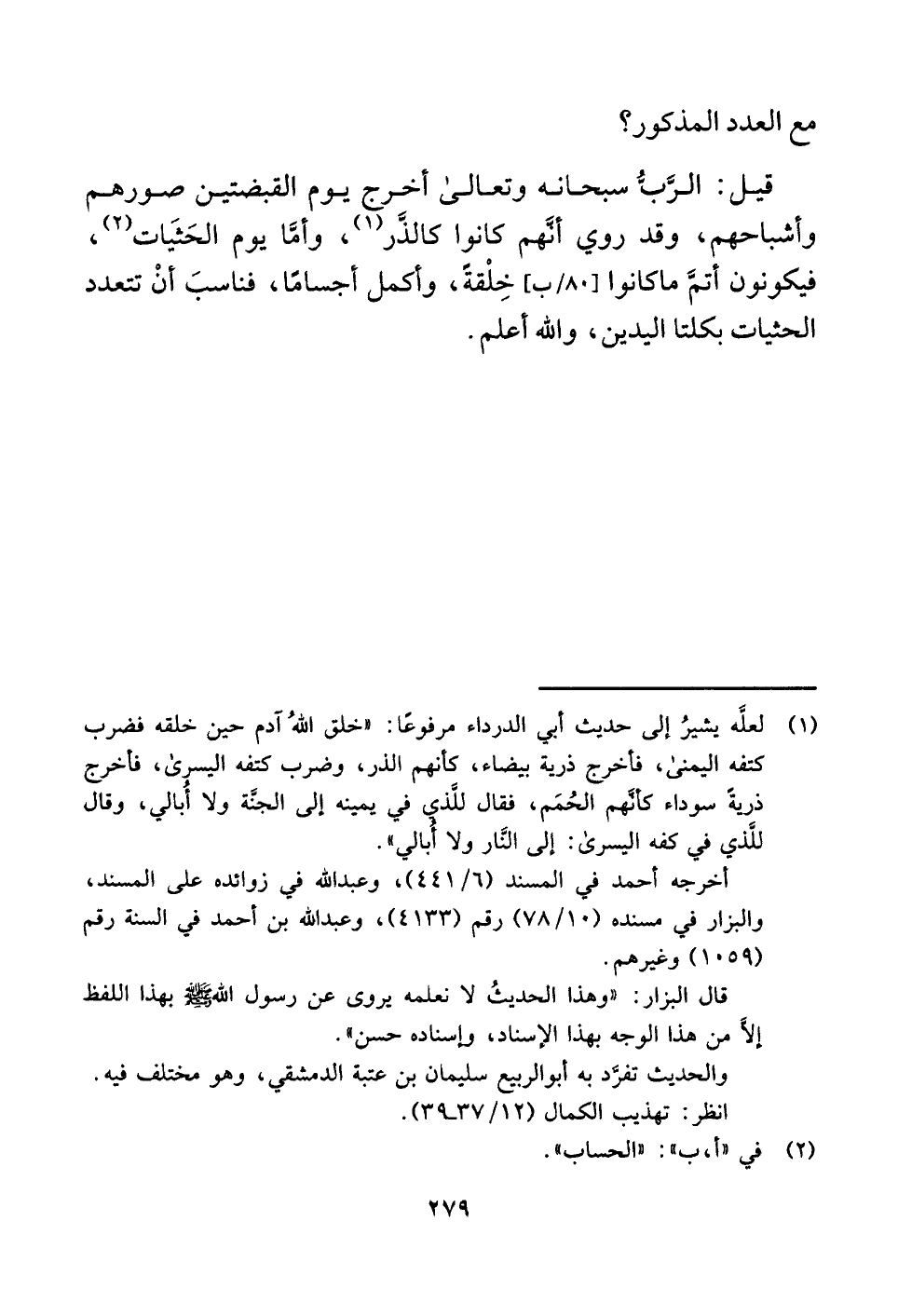 (¬١) لعلَّه يشيرُ إلى حديث أبي الدرداء مرفوعًا: "خلق اللَّهُ آدم حين خلقه فضرب كتفه اليمنى، فأخرج ذرية بيضاء، كأنهم الذر، وضرب كتفه اليسرى، فأخرج ذريةً سوداء كأنَّهم الحُمَم، فقال للَّذي في يمينه إلى الجنَّة ولا أُبالي، وقال للَّذي في كفه اليسرى: إلى النَّار ولا أُبالي".