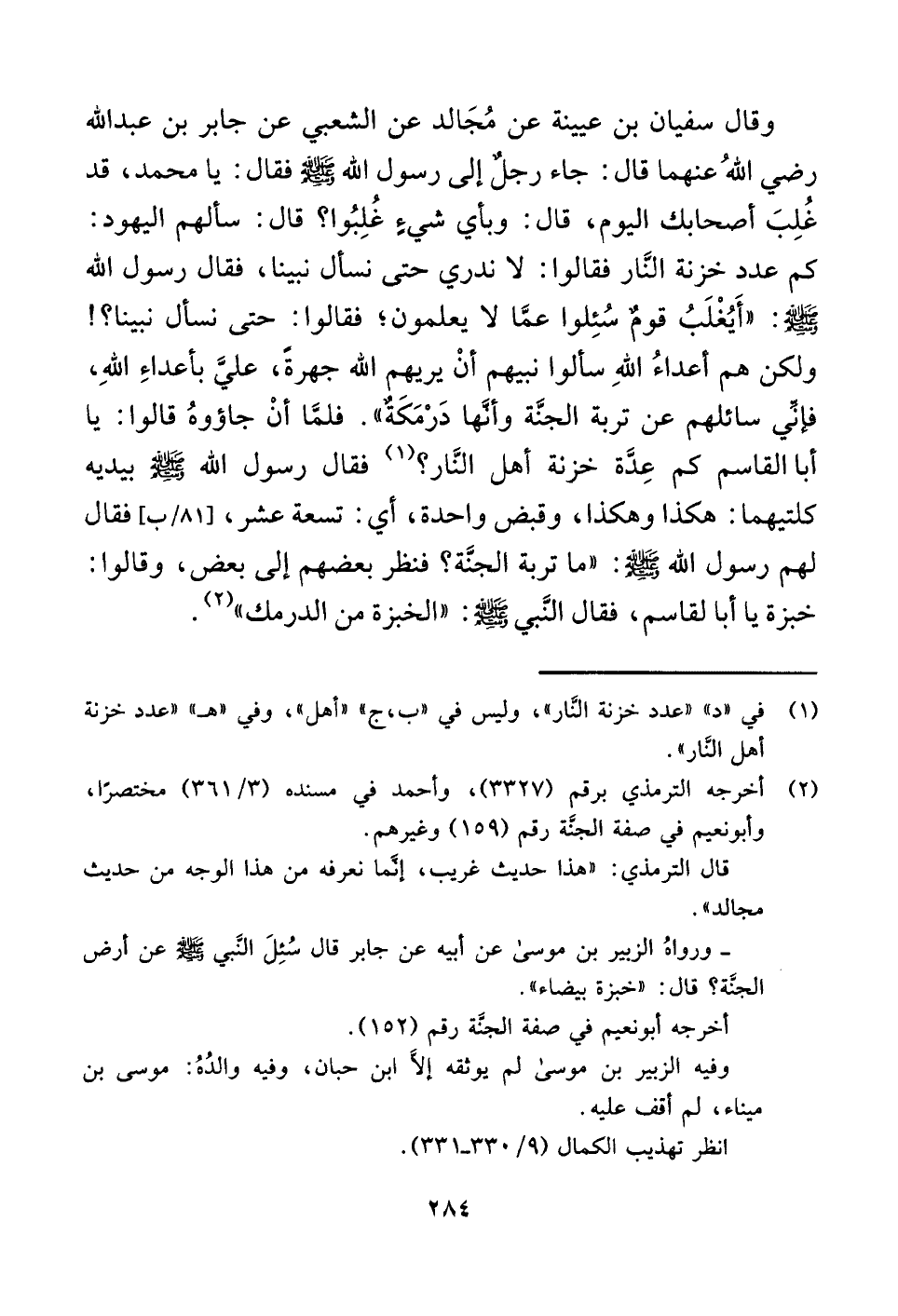 وقال سفيان بن عيينة عن مُجَالد عن الشعبي عن جابر بن عبد اللَّه رضي اللَّهُ عنهما قال: جاء رجلٌ إلى رسول اللَّه -صلى اللَّه عليه وسلم- فقال: يا محمد، قد غُلِبَ أصحابك اليوم، قال: وبأي شيءٍ غُلِبُوا؟ قال: سألهم اليهود: كم عدد خزنة النَّار فقالوا: لا ندري حتى نسأل نبينا، فقال رسول اللَّه -صلى اللَّه عليه وسلم-: "أَيُغْلَبُ قومٌ سُئِلوا عمَّا لا يعلمون؛ فقالوا: حتى نسأل نبينا؟! ولكن هم أعداءُ اللَّهِ سألوا نبيهم أنْ يريهم اللَّه جهرةً، عليَّ بأعداءِ اللَّهِ، فإنِّي سائلهم عن تربة الجنَّة وأنَّها دَرْمَكَةٌ". فلمَّا أنْ جاؤوهُ قالوا: يا أبا القاسم كم عِدَّة خزنة أهل النَّار؟ (¬١) فقال رسول اللَّه -صلى اللَّه عليه وسلم- بيديه كلتيهما: هكذا وهكذا، وقبض واحدة، أي: تسعة عشر، فقال لهم رسول اللَّه -صلى اللَّه عليه وسلم-: "ما تربة الجنَّة؟ فنظر بعضهم إلى بعض، وقالوا: خبزة يا أبا القاسم، فقال النَّبي -صلى اللَّه عليه وسلم-: "الخبزة من الدرمك" (¬٢) .