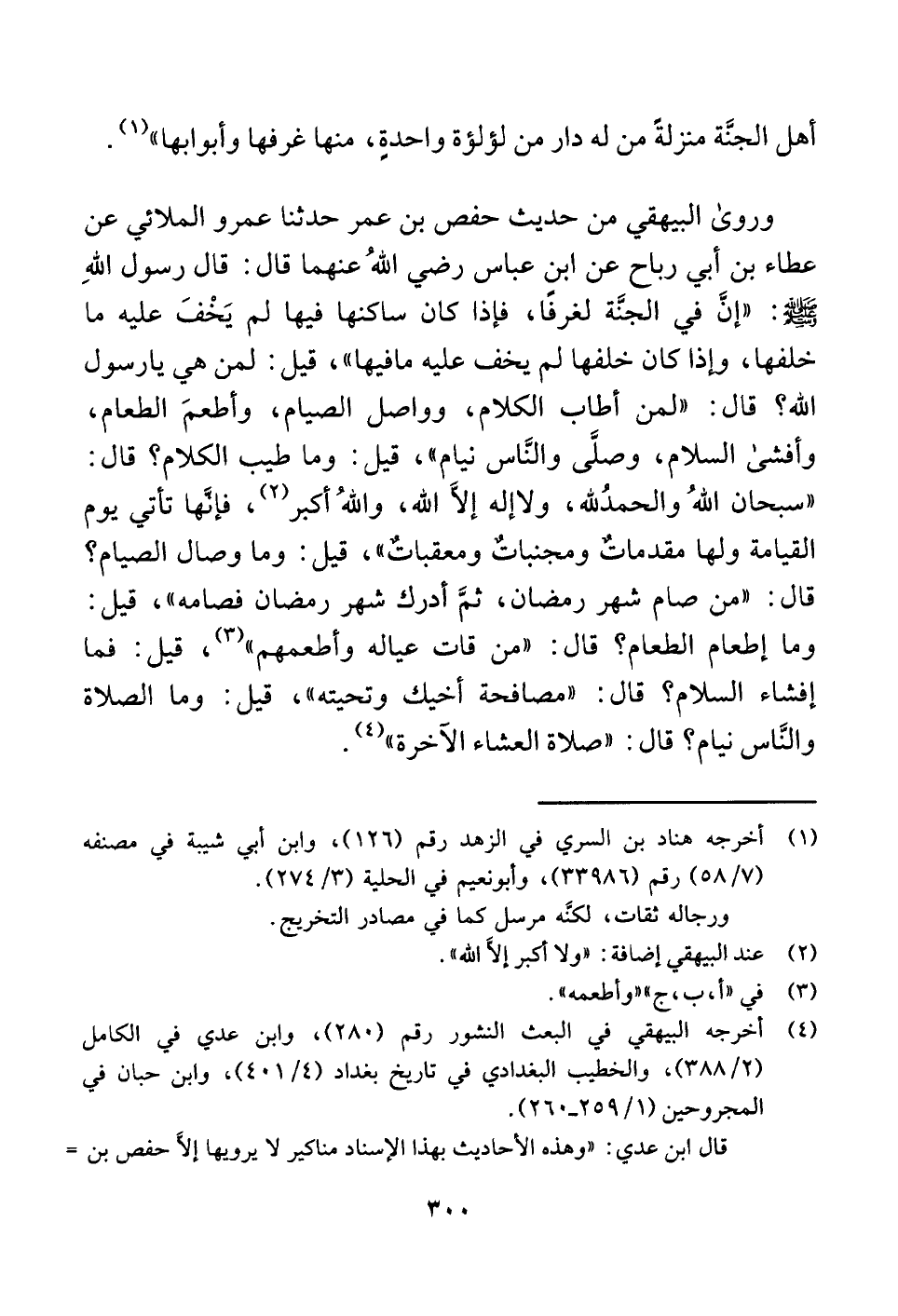 وروى البيهقي من حديث حفص بن عمر حدثنا عمرو الملائي عن عطاء بن أبي رباح عن ابن عباس رضي اللَّهُ عنهما قال: قال رسول اللَّهِ -صلى اللَّه عليه وسلم-: "إنَّ في الجنَّة لغرفًا، فإذا كان ساكنها فيها لم يَخْفَ عليه ما خلفها، وإذا كان خلفها لم يخف عليه ما فيها"، قيل: لمن هي يا رسول اللَّه؟ قال: "لمن أطاب الكلام، وواصل الصيام، وأطعمَ الطعام، وأفشى السلام، وصلَّى والنَّاس نيام"، قيل: وما طيب الكلام؟ قال: "سبحان اللَّهُ والحمدُ للَّه، ولا إله إلَّا اللَّه، واللَّهُ أكبر (¬٢) ، فإنَّها تأتي يوم القيامة ولها مقدماتٌ ومجنباتٌ ومعقباتٌ"، قيل: وما وصال الصيام؟ قال: "من صام شهر رمضان، ثمَّ أدرك شهر رمضان فصامه"، قيل: وما إطعام الطعام؟ قال: "من قات عياله وأطعمهم" (¬٣) ، قيل: فما إفشاء السلام؟ قال: "مصافحة أخيك وتحيته"، قيل: وما الصلاة والنَّاس نيام؟ قال: "صلاة العشاء الآخرة" (¬٤) .