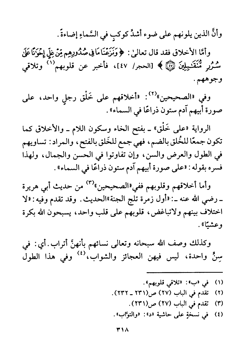 وأمَّا الأخلاق فقد قال تعالى: {وَنَزَعْنَا مَا فِي صُدُورِهِمْ مِنْ غِلٍّ إِخْوَانًا عَلَى سُرُرٍ مُتَقَابِلِينَ (٤٧) } [الحجر: ٤٧]، فأخبر عن قلوبهم (¬١) وتلاقي وجوههم.