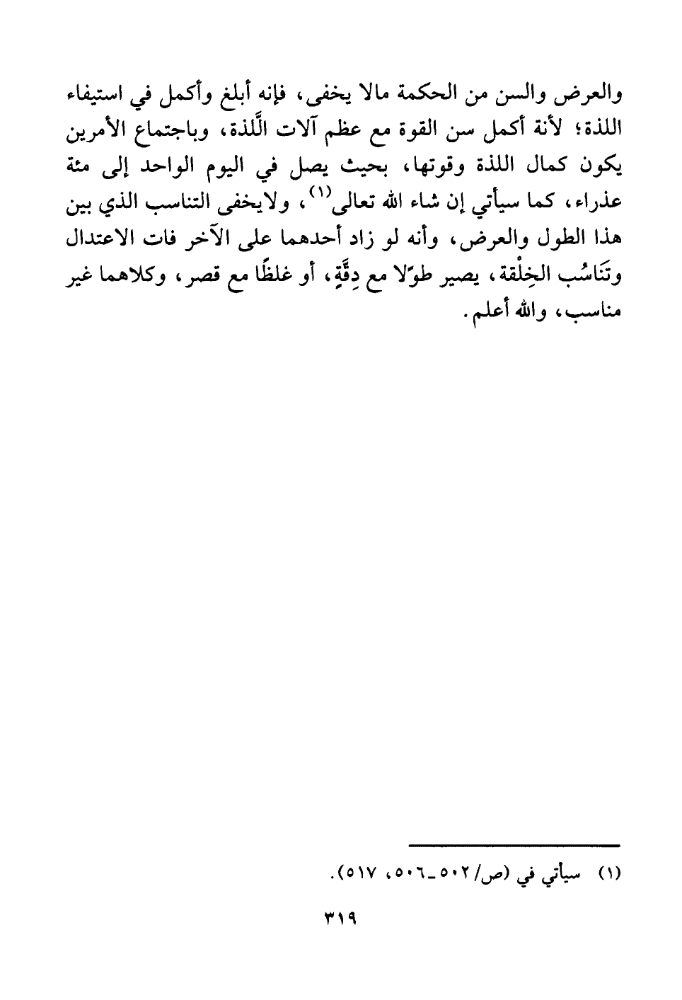 والعرض والسن من الحكمة ما لا يخفى، فإنه أبلغ وأكمل في استيفاء اللذة؛ لأنة أكمل سن القوة مع عظم آلات الَّلذة، وباجتماع الأمرين يكون كمال اللذة وقوتها، بحيث يصل في اليوم الواحد إلى مئة عذراء، كما سيأتي إن شاء اللَّه تعالى (¬١) ، ولا يخفى التناسب الذي بين هذا الطول والعرض، وأنه لو زاد أحدهما على الآخر فات الاعتدال وتَنَاسُب الخِلْقة، يصير طولًا مع دِقَّةٍ، أو غلظًا مع قصر، وكلاهما غير مناسب، واللَّه أعلم.
