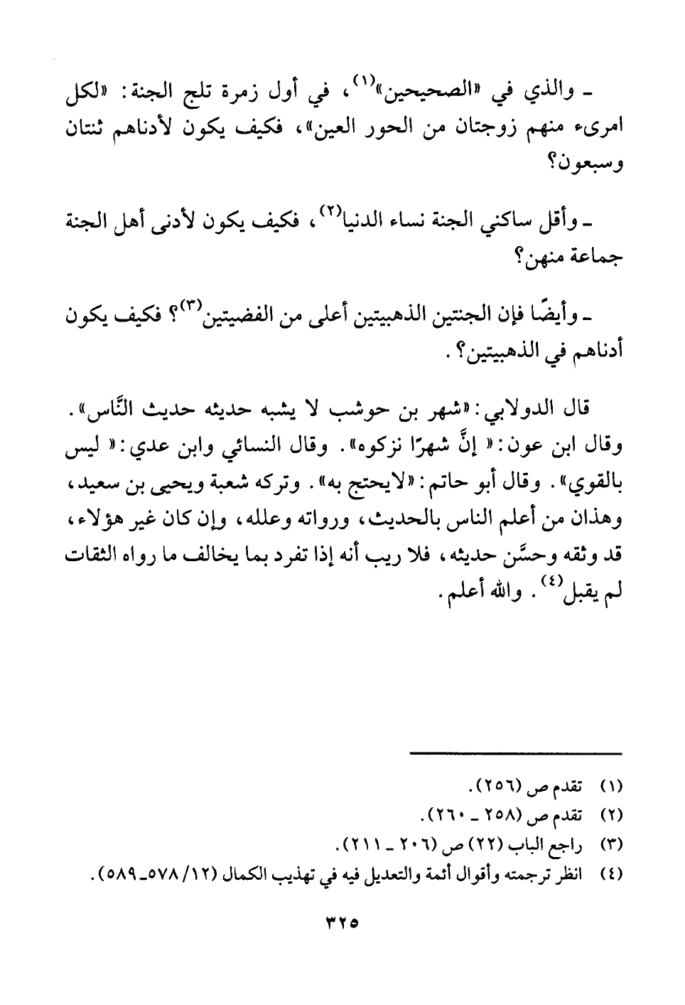 قال الدولابي: "شهر بن حوشب لا يشبه حديثه حديث النَّاس". وقال ابن عون: "إنَّ شهرًا نزكوه". وقال النسائي وابن عدي: "ليس بالقوي". وقال أبو حاتم: "لا يحتج به". وتركه شعبة ويحيى بن سعيد، وهذان من أعلم الناس بالحديث، ورواته وعلله، وإن كان غير هؤلاء، قد وثقه وحسَّن حديثه، فلا ريب أنه إذا تفرد بما يخالف ما رواه الثقات لم يقبل (¬٤) . واللَّه أعلم.
