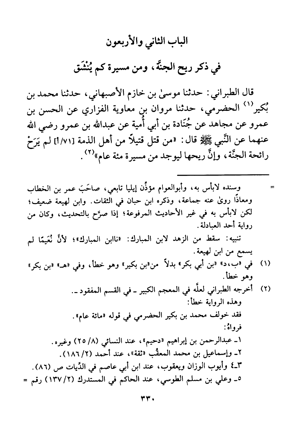 قال الطبراني: حدثنا موسى بن خازم الأصبهاني، حدثنا محمد بن بُكير (¬١) الحضرمي، حدثنا مروان بن معاوية الفزاري عن الحسن بن عمرو عن مجاهد عن جُنَادة بن أبي أُمية عن عبد اللَّه بن عمرو رضي اللَّه عنهما عن النَّبي -صلى اللَّه عليه وسلم- قال: "من قتل قتيلًا من أهل الذمة لم يَرَحْ رائحة الجنَّة، وإنَّ ريحها ليوجد من مسيرة مئة عام" (¬٢).