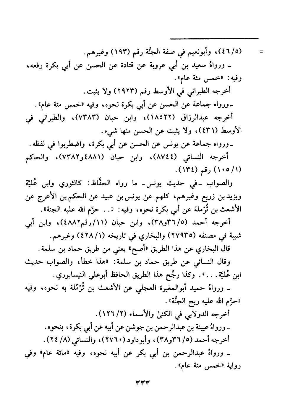 والصواب -في حديث يونس- ما رواه الحفَّاظ: كالثوري وابن عُليَّة ويزيد بن زريع وغيرهم، كلهم عن يونس بن عبيد عن الحكم بن الأعرج عن الأشعث بن ثُرْملة عن أبي بكرة نحوه، وفيه: ". . حرَّم اللَّه عليه الجنة".