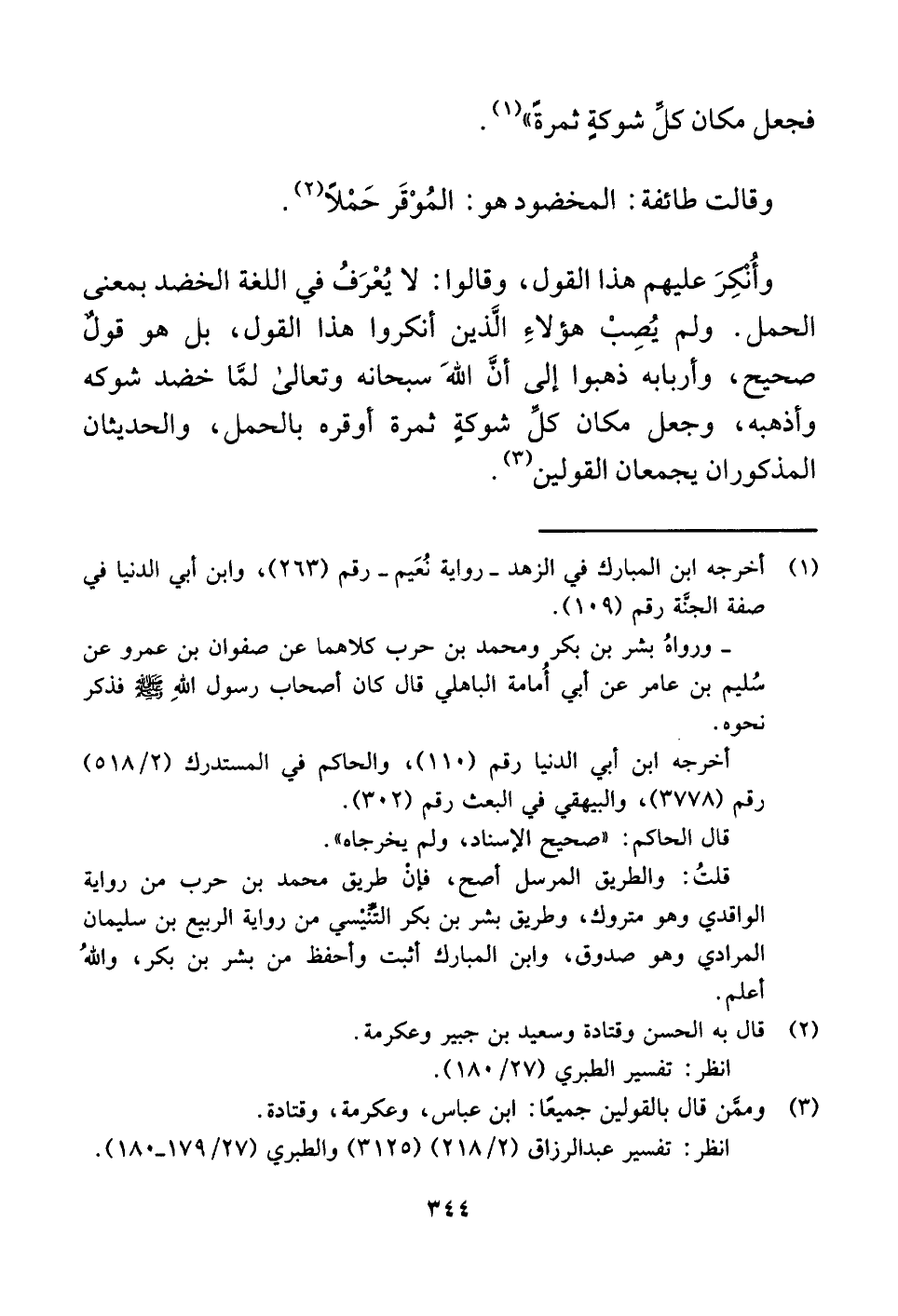 وأُنْكِرَ عليهم هذا القول، وقالوا: لا يُعْرَفُ في اللغة الخضد بمعنى الحمل. ولم يُصِبْ هؤلاءِ الَّذين أنكروا هذا القول، بل هو قولٌ صحيح، وأربابه ذهبوا إلى أنَّ اللَّهَ سبحانه وتعالى لمَّا خضد شوكه وأذهبه، وجعل مكان كلِّ شوكةٍ ثمرة أوقره بالحمل، والحديثان المذكوران يجمعان القولين (¬٣) .