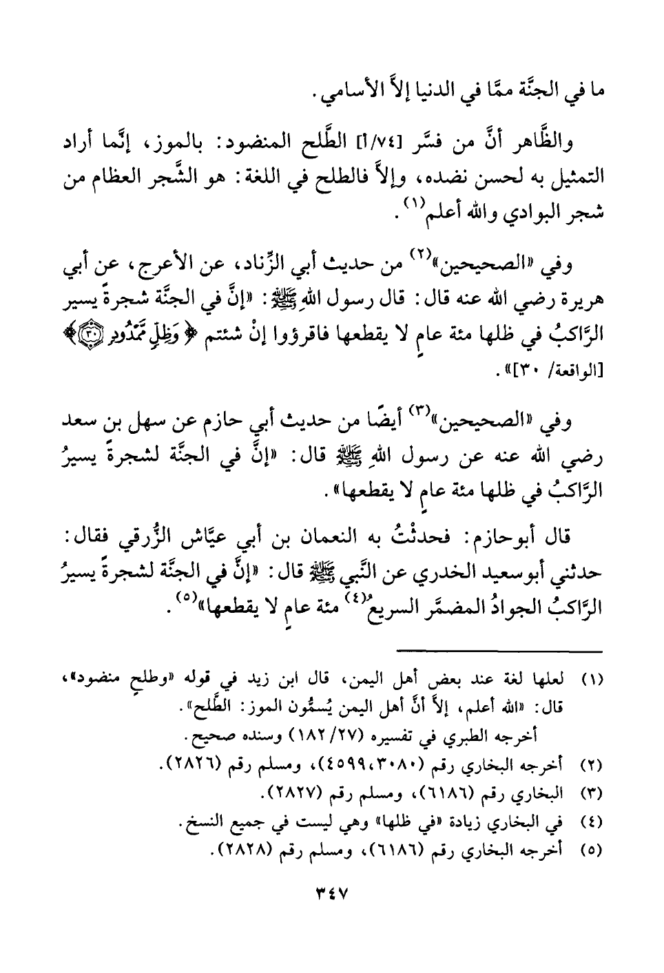 والظَّاهر أنَّ من فسَّر الطَّلح المنضود: بالموز، إنَّما أراد التمثيل به لحسن نضده، وإلَّا فالطلح في اللغة: هو الشَّجر العظام من شجر البوادي واللَّه أعلم (¬١) .