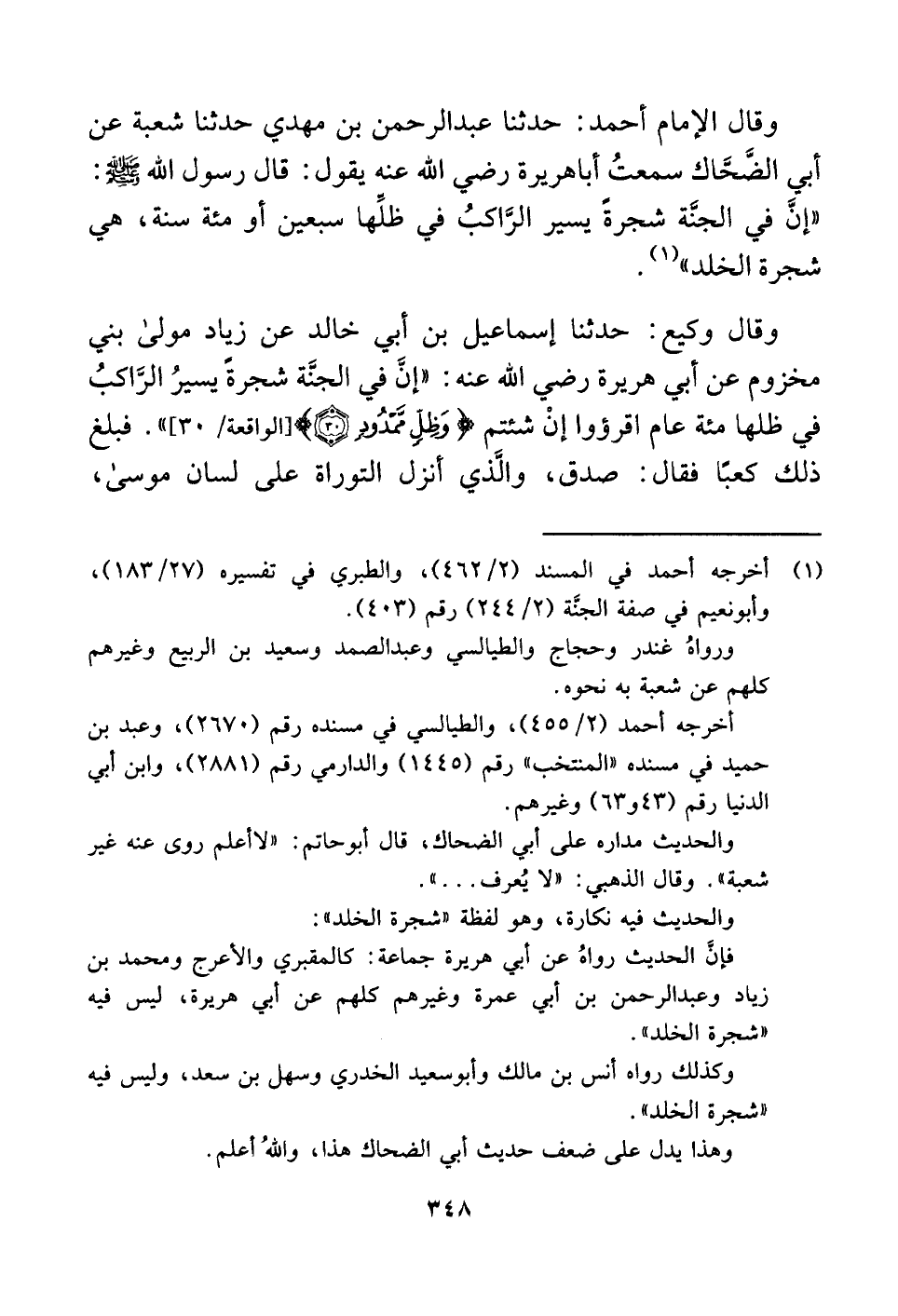 وقال الإمام أحمد: حدثنا عبد الرحمن بن مهدي حدثنا شعبة عن أبي الضَّحَّاك سمعتُ أبا هريرة رضي اللَّه عنه يقول: قال رسول اللَّه -صلى اللَّه عليه وسلم-: "إنَّ في الجنَّة شجرةً يسير الرَّاكبُ في ظلِّها سبعين أو مئة سنة، هي شجرة الخلد" (¬١) .