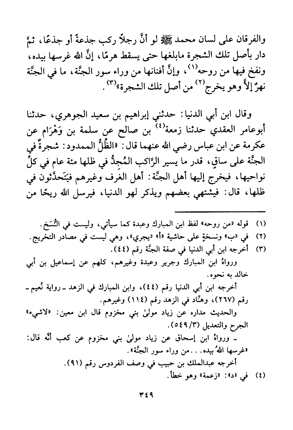- ورواهُ ابن إسحاق عن زياد مولى بني مخزوم عن كعب أنَّه قال: "غرسها اللَّهُ بيده. . . من وراء سور الجنَّة".