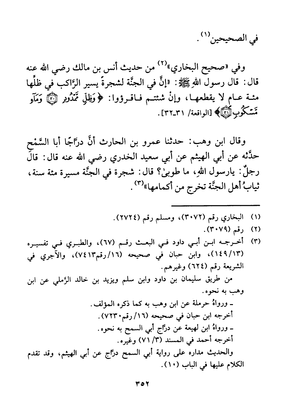 وقال ابن وهب: حدثنا عمرو بن الحارث أنَّ درَّاجًا أبا السَّمْحِ حدَّثه عن أبي الهيثم عن أبي سعيد الخدري رضي اللَّه عنه قال: قال رجلٌ: يا رسول اللَّهِ، ما طوبى؟ قال: شجرة في الجنَّة مسيرة مئة سنة، ثيابُ أهل الجنَّة تخرج من أكمامها" (¬٣) .
