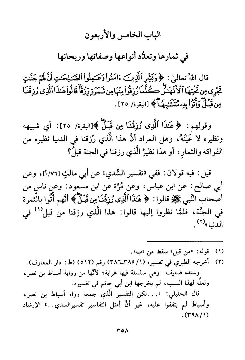 وقولهم: {هَذَا الَّذِي رُزِقْنَا مِنْ قَبْلُ} [البقرة: ٢٥]: أي شبيهه ونظيره لا عَيْنَهُ، وهل المراد أنَّ هذا الَّذي رُزقنا في الدنيا نظيره من الفواكه والثمارِ، أو هذا نظيرُ الَّذي رزقنا في الجنة قبلُ؟