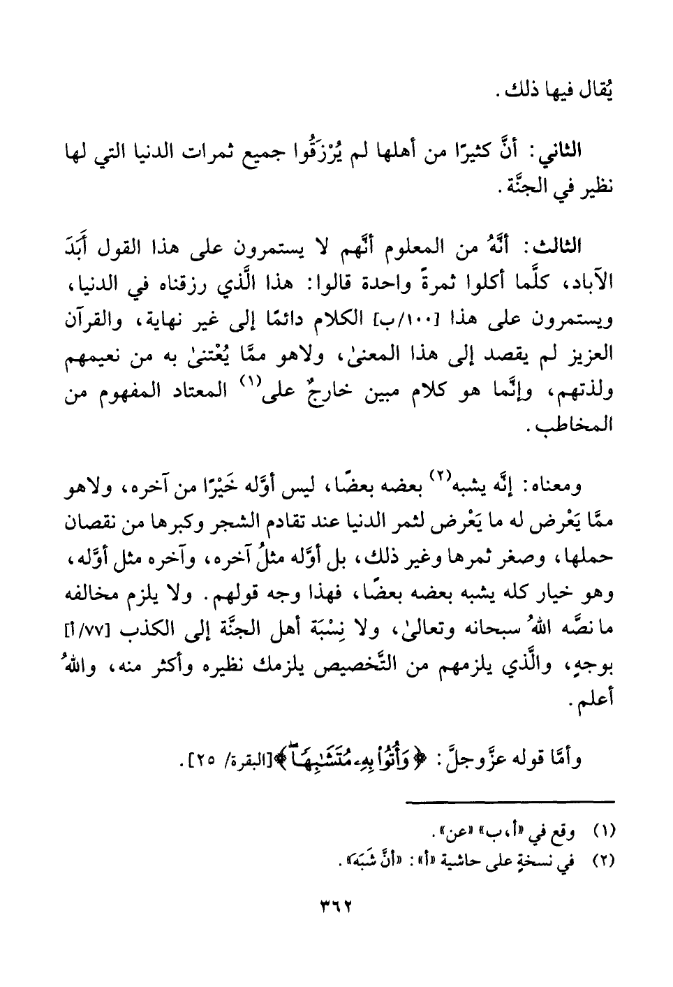 الثالث: أنَّهُ من المعلوم أنَّهم لا يستمرون على هذا القول أَبَدَ الآباد، كلَّما أكلوا ثمرةً واحدة قالوا: هذا الَّذي رزقناه في الدنيا، ويستمرون على هذا الكلام دائمًا إلى غير نهاية، والقرآن العزيز لم يقصد إلى هذا المعنى، ولا هو ممَّا يُعْتنى به من نعيمهم ولذتهم، وإنَّما هو كلام مبين خارجٌ على (¬١) المعتاد المفهوم من المخاطب.