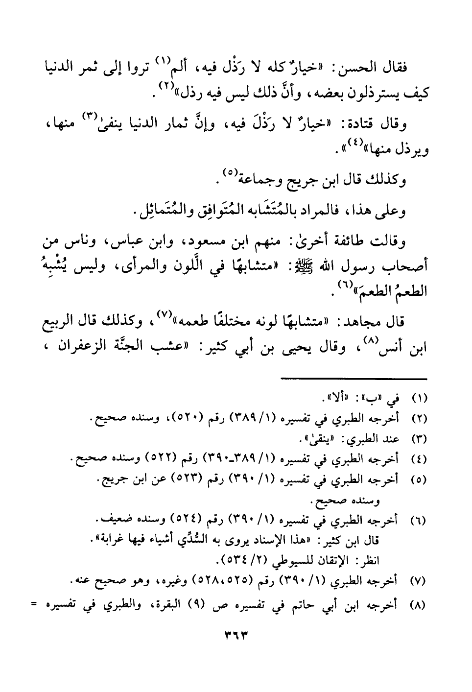 وقالت طائفة أخرى: منهم ابن مسعود، وابن عباس، وناس من أصحاب رسول اللَّه -صلى اللَّه عليه وسلم-: "متشابهًا في الَّلون والمرأى، وليس يُشْبِهُ الطعمُ الطعمَ" (¬٦) .
