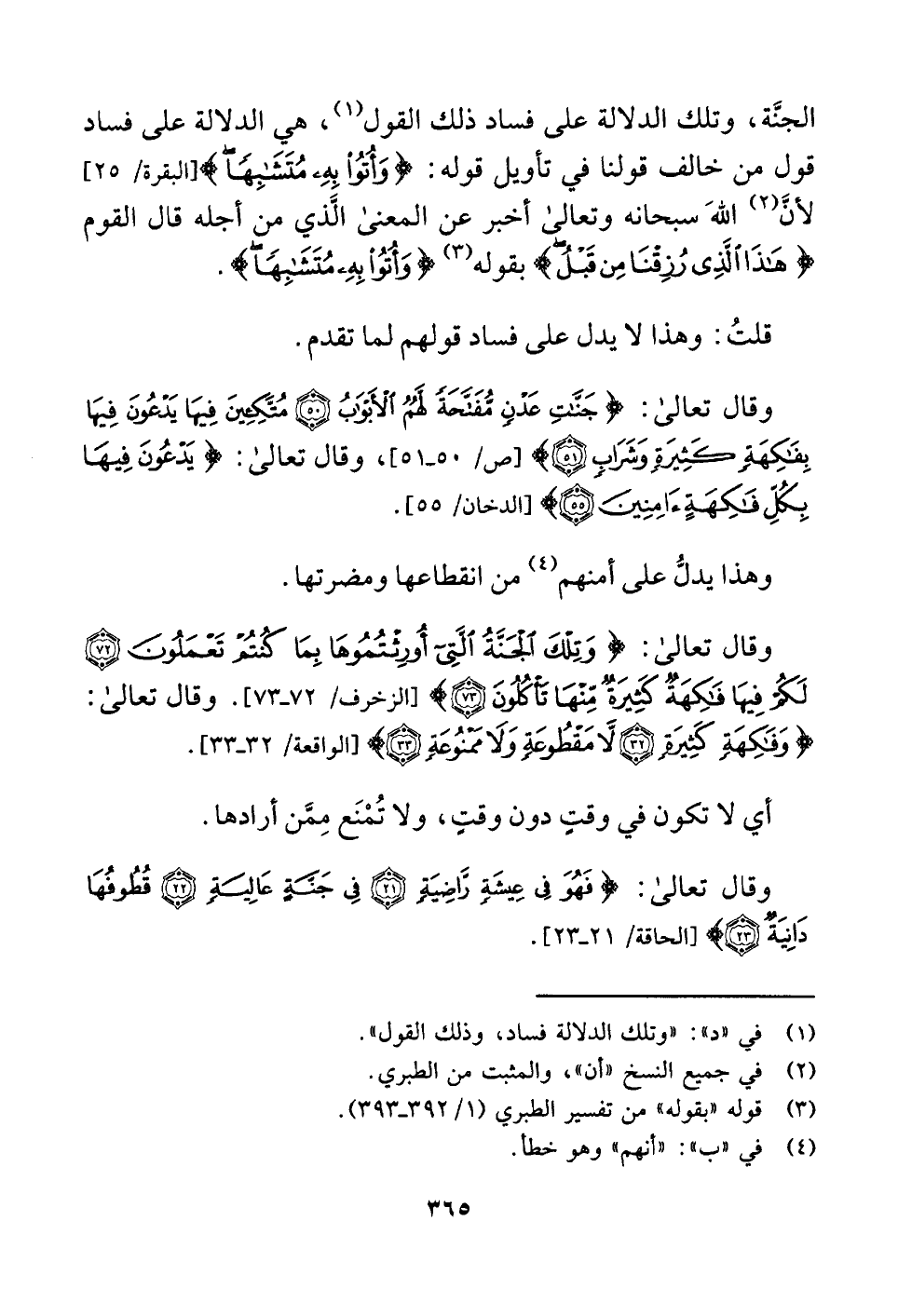 وقال تعالى: {وَتِلْكَ الْجَنَّةُ الَّتِي أُورِثْتُمُوهَا بِمَا كُنْتُمْ تَعْمَلُونَ (٧٢) لَكُمْ فِيهَا فَاكِهَةٌ كَثِيرَةٌ مِنْهَا تَأْكُلُونَ (٧٣) } [الزخرف: ٧٢ - ٧٣]. وقال تعالى: {وَفَاكِهَةٍ كَثِيرَةٍ (٣٢) لَا مَقْطُوعَةٍ وَلَا مَمْنُوعَةٍ (٣٣) } [الواقعة: ٣٢ - ٣٣].