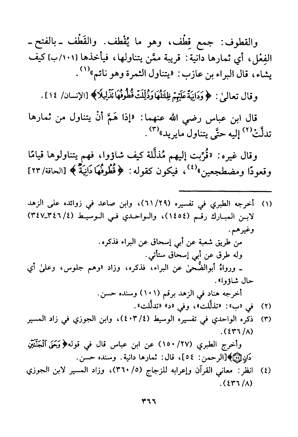 والقطوف: جمع قِطْف، وهو ما يُقْطف. والقَطْف -بالفتح- الفِعْل، أي ثمارها دانية: قريبة ممَّن يتناولها، فيأخذها كيف يشاء، قال البراء بن عازب: "يتناول الثمرة وهو نائم" (¬١) .