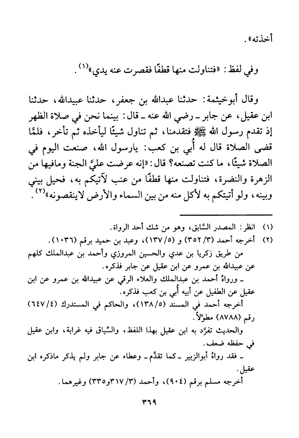 وقال أبو خيثمة: حدثنا عبد اللَّه بن جعفر، حدثنا عبيد اللَّه، حدثنا ابن عقيل، عن جابر -رضي اللَّه عنه- قال: بينما نحن في صلاة الظهر إذ تقدم رسول اللَّه -صلى اللَّه عليه وسلم- فتقدمنا، ثم تناول شيئًا ليأخذه ثم تأخر، فلمَّا قضى الصلاة قال له أُبي بن كعب: يا رسول اللَّه، صنعت اليوم في الصلاة شيئًا، ما كنت تصنعه؟ قال: "إنه عرضت عليَّ الجنة وما فيها من الزهرة والنضرة، فتناولت منها قطفًا من عنب لآتيكم به، فحيل بيني وبينه، ولو أتيتكم به لأكل منه من بين السماء والأرض لا ينقصونه" (¬٢) .