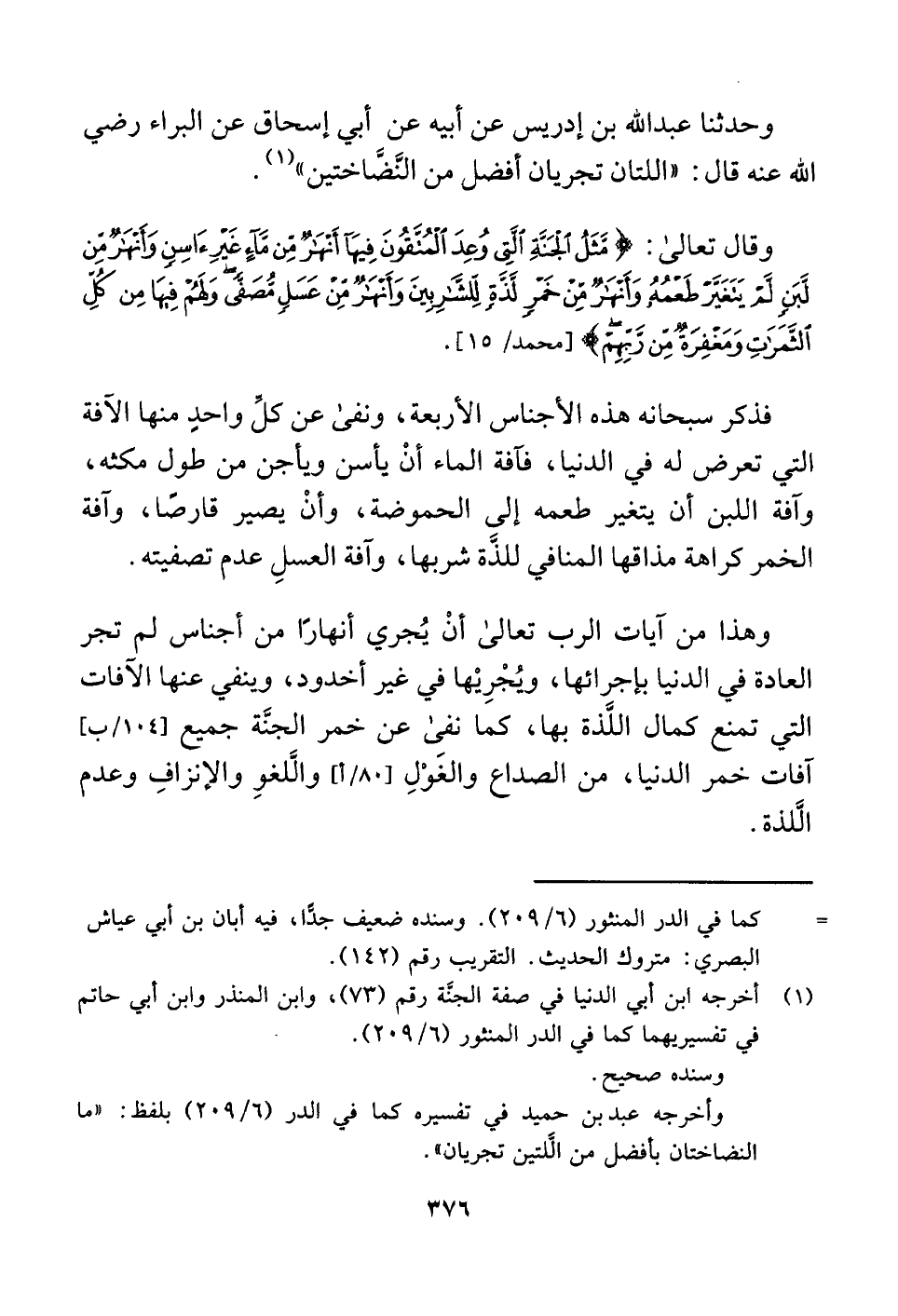 (¬١) أخرجه ابن أبي الدنيا في صفة الجنَّة رقم (٧٣)، وابن المنذر وابن أبي حاتم في تفسيريهما كما في الدر المنثور (٦/ ٢٠٩).