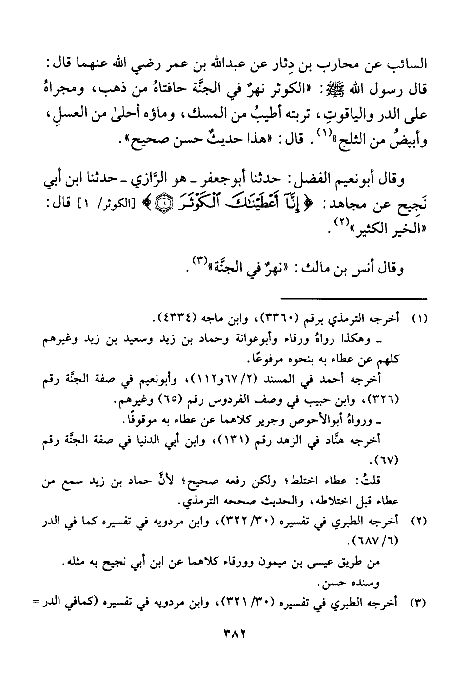 السائب عن محارب بن دِثار عن عبد اللَّه بن عمر رضي اللَّه عنهما قال: قال رسول اللَّه -صلى اللَّه عليه وسلم-: "الكوثر نهرٌ في الجنَّة حافتاهُ من ذهب، ومجراهُ على الدر والياقوتِ، تربته أطيبُ من المسك، وماؤه أحلى من العسلِ، وأبيضُ من الثلج" (¬١) . قال: "هذا حديثٌ حسن صحيح".