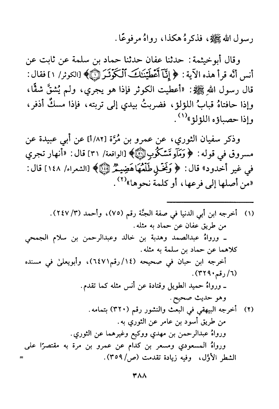 وقال أبو خيثمة: حدثنا عفان حدثنا حماد بن سلمة عن ثابت عن أنس أنَّه قرأ هذه الآية: {إِنَّا أَعْطَيْنَاكَ الْكَوْثَرَ ( ١)} [الكوثر: ١] فقال: قال رسول اللَّهِ -صلى اللَّه عليه وسلم-: "أعطيت الكوثر فإذا هو يجري، ولم يُشقَّ شقًّا، وإذا حافتاهُ قبابُ اللؤلؤ، فضربتُ بيدي إلى تربته، فإذا مسكٌ أذفر، وإذا حصباؤه اللؤلؤ" (¬١) .