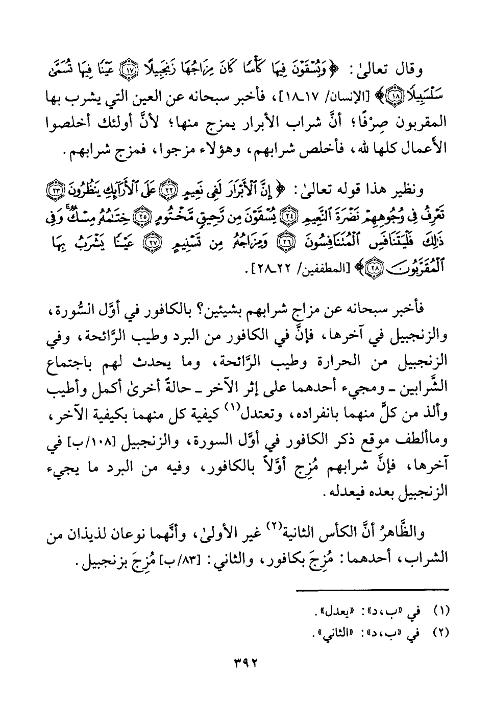 وقال تعالى: {وَيُسْقَوْنَ فِيهَا كَأْسًا كَانَ مِزَاجُهَا زَنْجَبِيلًا (١٧) عَيْنًا فِيهَا تُسَمَّى سَلْسَبِيلًا (١٨) } [الإنسان: ١٧، ١٨]، فأخبر سبحانه عن العين التي يشرب بها المقربون صِرْفًا؛ أنَّ شراب الأبرار يمزج منها؛ لأنَّ أولئك أخلصوا الأَعمال كلها للَّه، فأخلص شرابهم، وهؤلاء مزجوا، فمزج شرابهم.