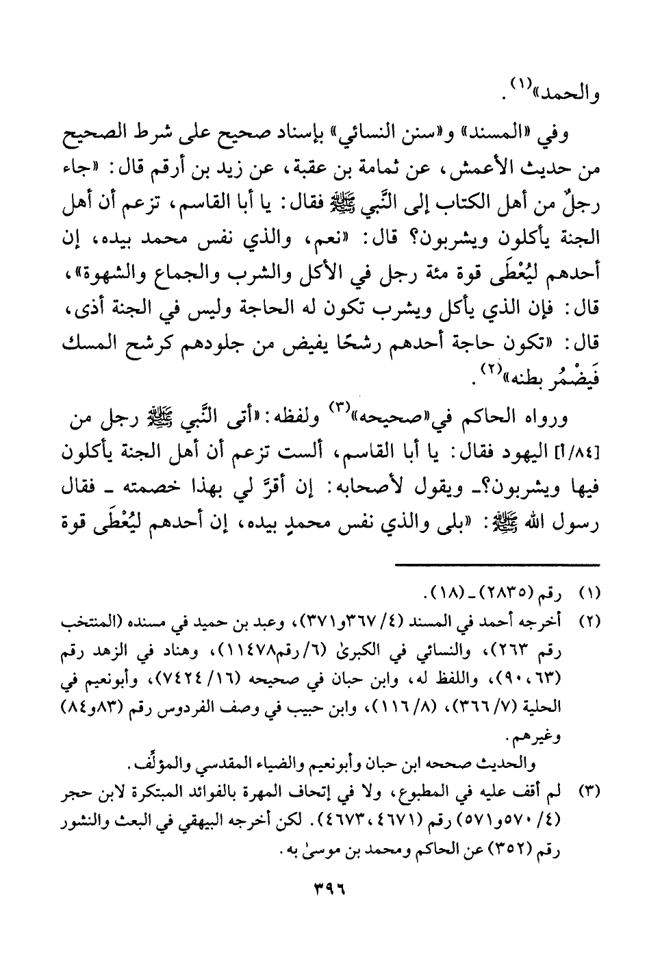 وفي "المسند" و"سنن النسائي" بإسناد صحيح على شرط الصحيح من حديث الأعمش، عن ثمامة بن عقبة، عن زيد بن أرقم قال: "جاء رجلٌ من أهل الكتاب إلى النَّبي -صلى اللَّه عليه وسلم- فقال: يا أبا القاسم، تزعم أن أهل الجنة يأكلون ويشربون؟ قال: "نعم، والذي نفس محمد بيده، إن أحدهم ليُعْطَى قوة مئة رجل في الأكل والشرب والجماع والشهوة"، قال: فإن الذي يأكل ويشرب تكون له الحاجة وليس في الجنة أذى، قال: "تكون حاجة أحدهم رشحًا يفيض من جلودهم كرشح المسك فَيضْمُر بطنه" (¬٢) .