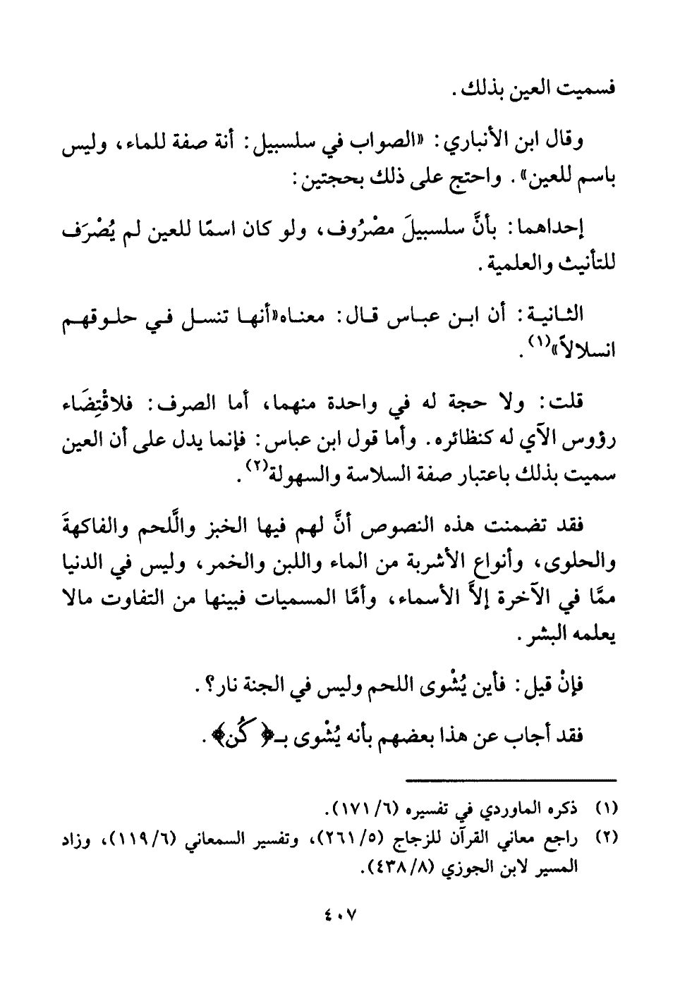 وقال ابن الأنباري: "الصواب في سلسبيل: أنه صفة للماء، وليس باسم للعين". واحتج على ذلك بحجتين: