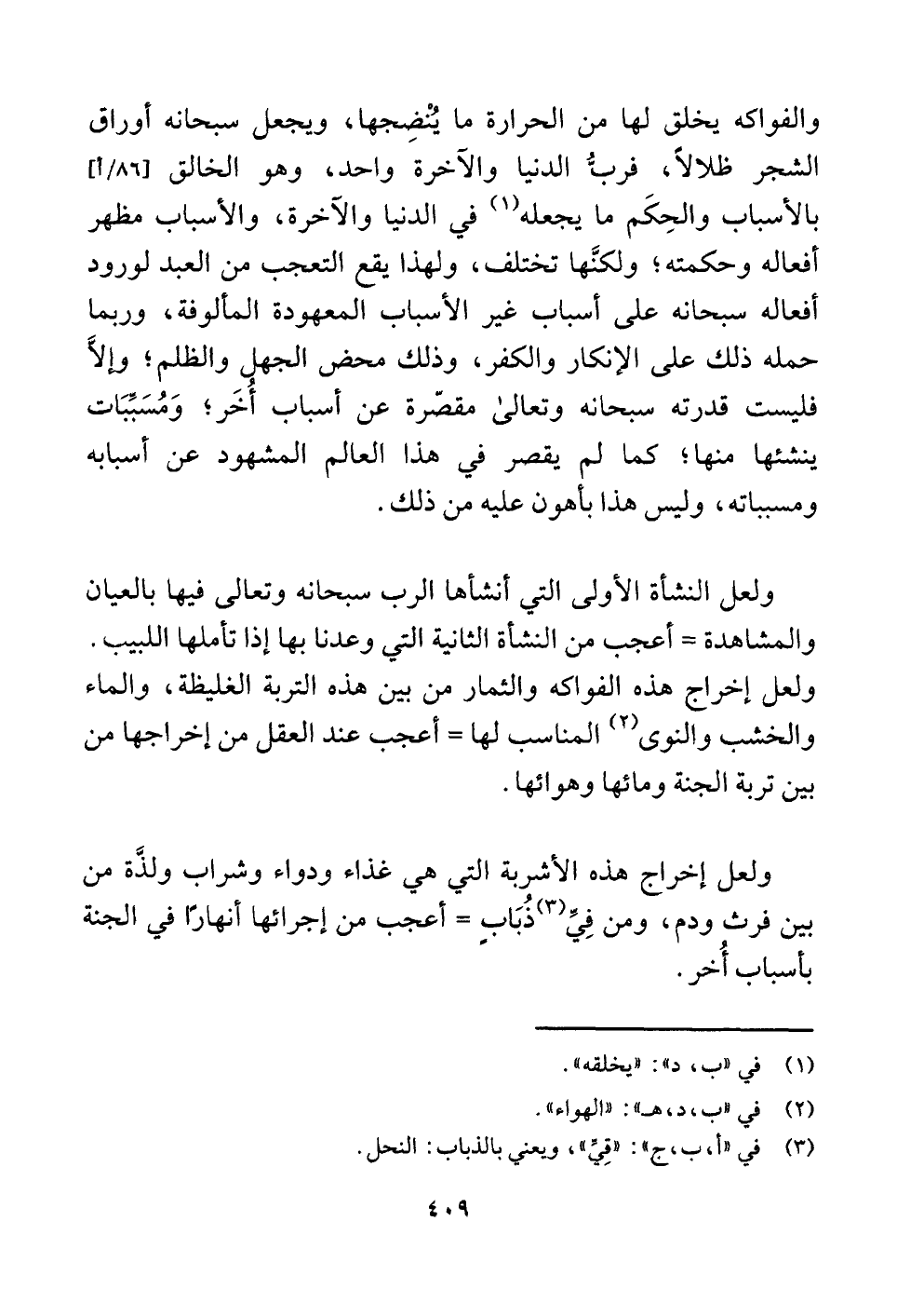 ولعل النشأة الأولى التي أنشأها الرب سبحانه وتعالى فيها بالعيان والمشاهدة = أعجب من النشأة الثانية التي وعدنا بها إذا تأملها اللبيب. ولعل إخراج هذه الفواكه والثمار من بين هذه التربة الغليظة، والماء والخشب والنوى (¬٢) المناسب لها = أعجب عند العقل من إخراجها من بين تربة الجنة ومائها وهوائها.