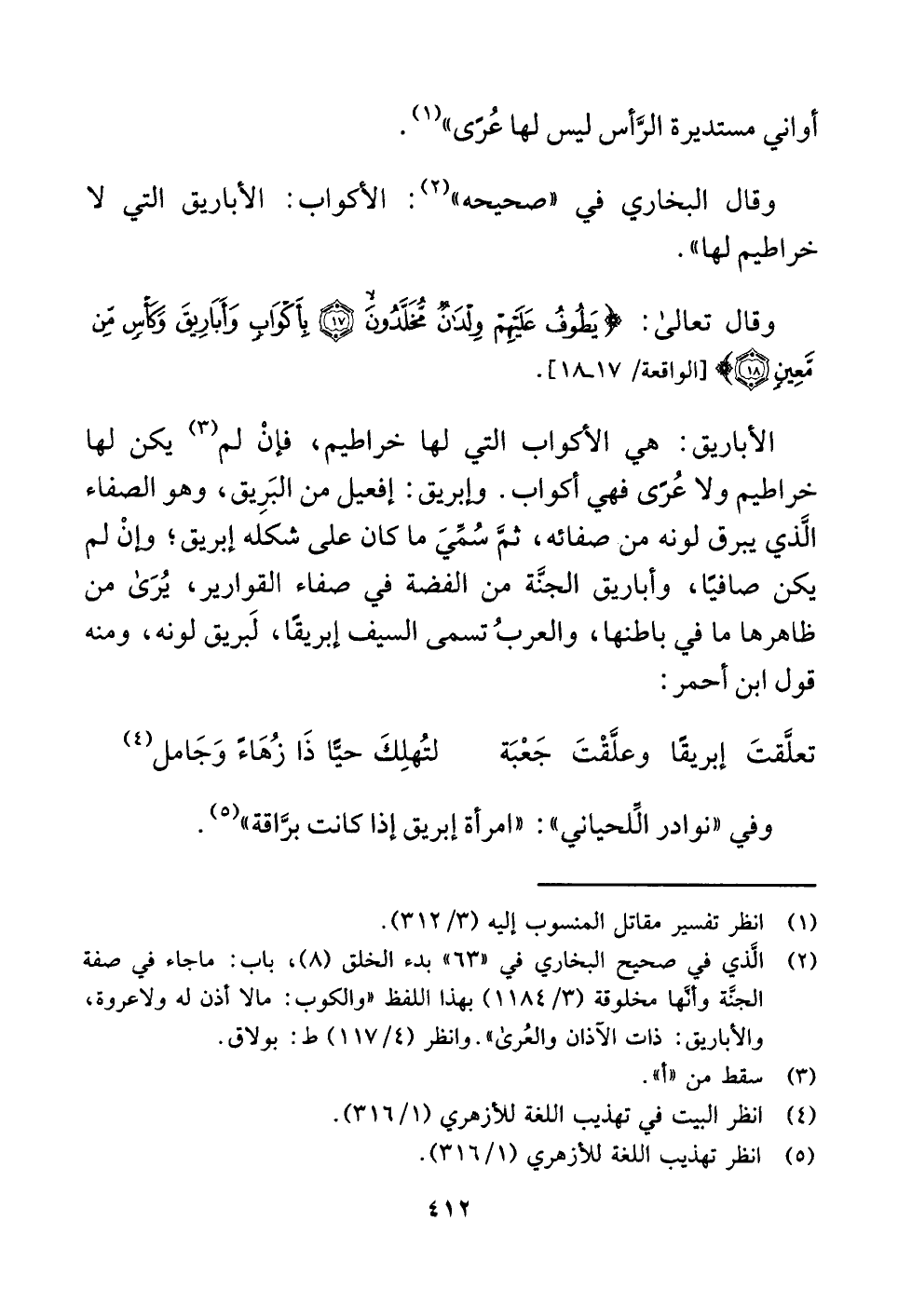 الأباريق: هي الأكواب التي لها خراطيم، فإنْ لم (¬٣) يكن لها خراطيم ولا عُرًى فهي أكواب. وإبريق: إفعيل من البَرِيق، وهو الصفاء الَّذي يبرق لونه من صفائه، ثمَّ سُمِّيَ ما كان على شكله إبريق؛ وإنْ لم يكن صافيًا، وأباريق الجنَّة من الفضة في صفاء القوارير، يُرَى من ظاهرها ما في باطنها، والعربُ تسمى السيف إبريقًا، لَبريق لونه، ومنه قول ابن أحمر: