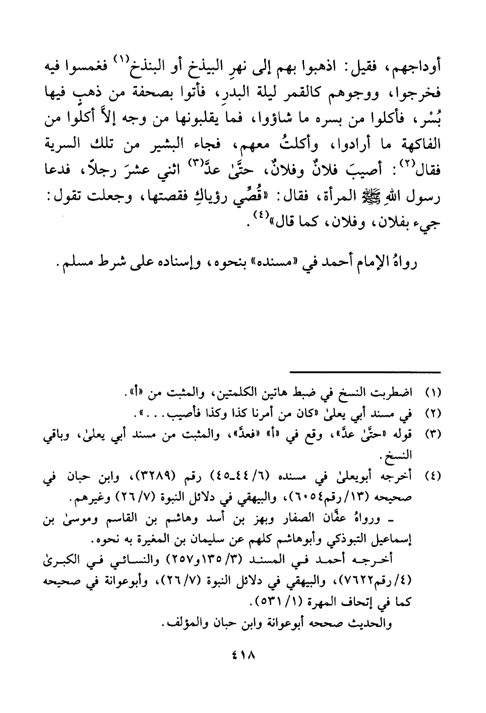 أوداجهم، فقيل: اذهبوا بهم إلى نهرِ البيذخ أو البنذخ (¬١) فغمسوا فيه فخرجوا، ووجوهم كالقمر ليلة البدرِ، فأتوا بصحفة من ذهبٍ فيها بُسْر، فأكلوا من بسره ما شاؤوا، فما يقلبونها من وجه إلَّا أكلوا من الفاكهة ما أرادوا، وأكلتُ معهم، فجاء البشير من تلك السرية فقال (¬٢) : أصيبَ فلانٌ وفلانٌ، حتَّى عدَّ (¬٣) اثني عشرَ رجلًا، فدعا رسول اللَّهِ -صلى اللَّه عليه وسلم- المرأة، فقال: "قُصِّي رؤياكِ فقصتها، وجعلت تقول: جيء بفلان، وفلان، كما قال" (¬٤) .