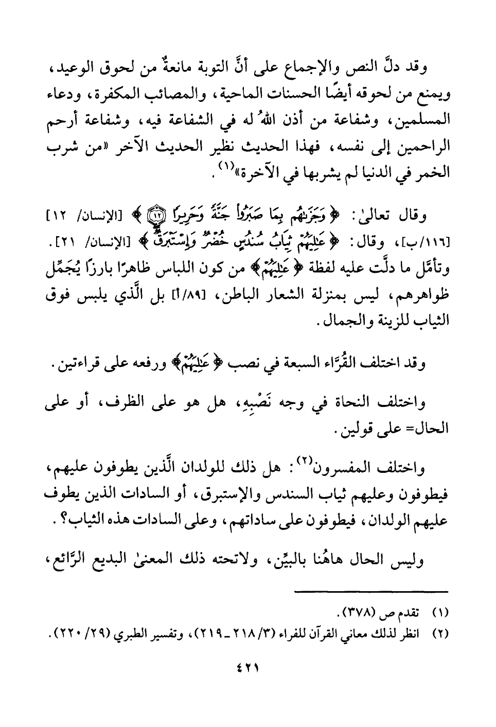 واختلف المفسرون (¬٢) : هل ذلك للولدان الَّذين يطوفون عليهم، فيطوفون وعليهم ثياب السندس والإستبرق، أو السادات الذين يطوف عليهم الولدان، فيطوفون على ساداتهم، وعلى السادات هذه الثياب؟.
