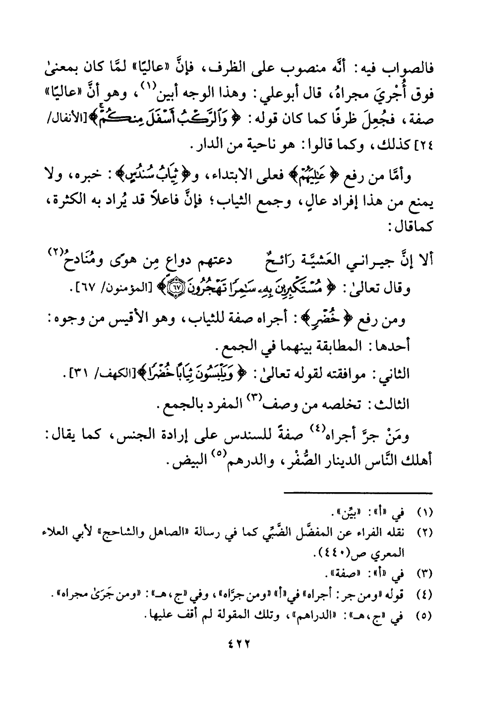 ومن رفع {خُضْرًا}: أجراه صفة للثياب، وهو الأقيس من وجوه: أحدها: المطابقة بينهما في الجمع.