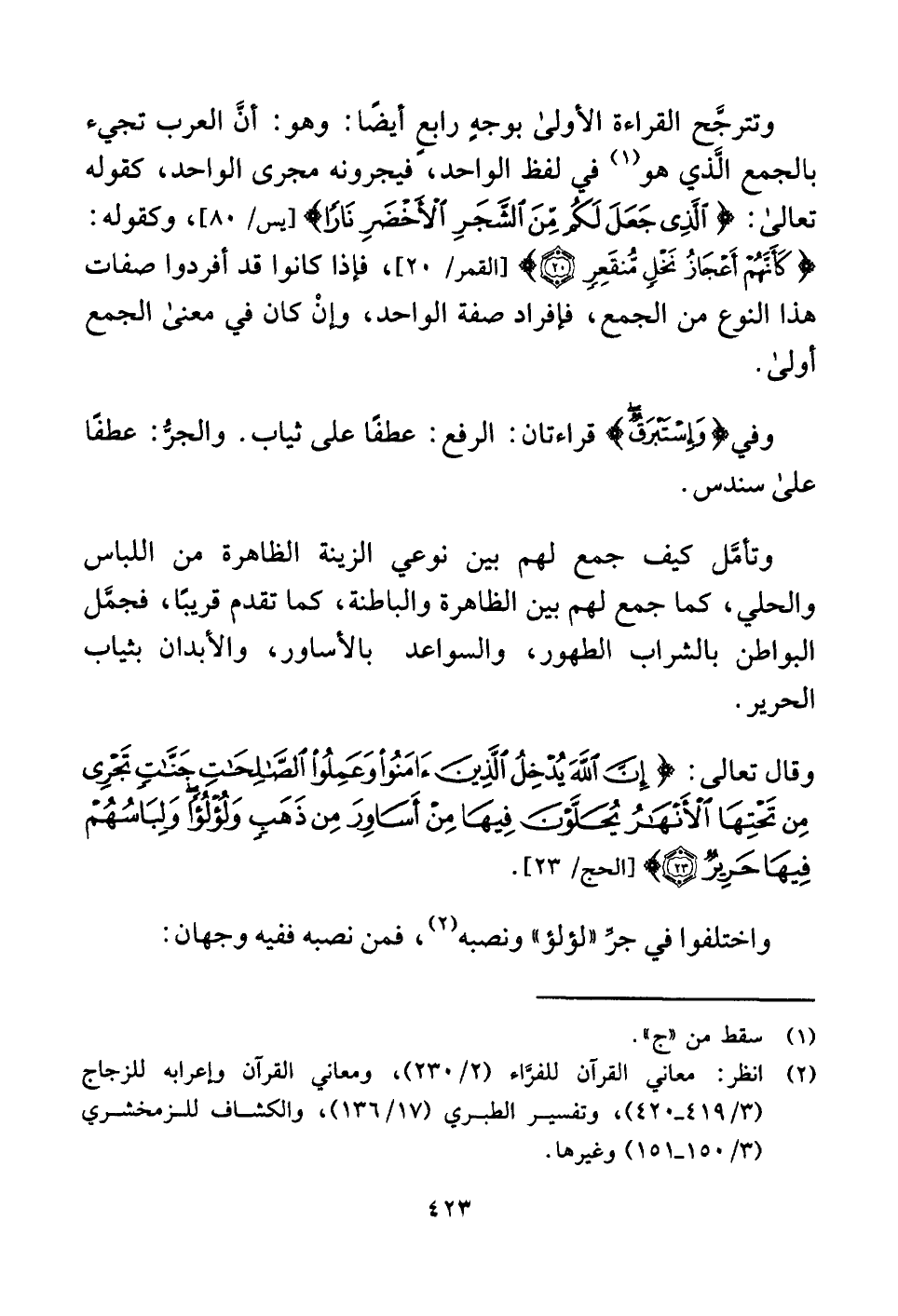 واختلفوا في جرِّ "لؤلؤ" ونصبه (¬٢) ، فمن نصبه ففيه وجهان: