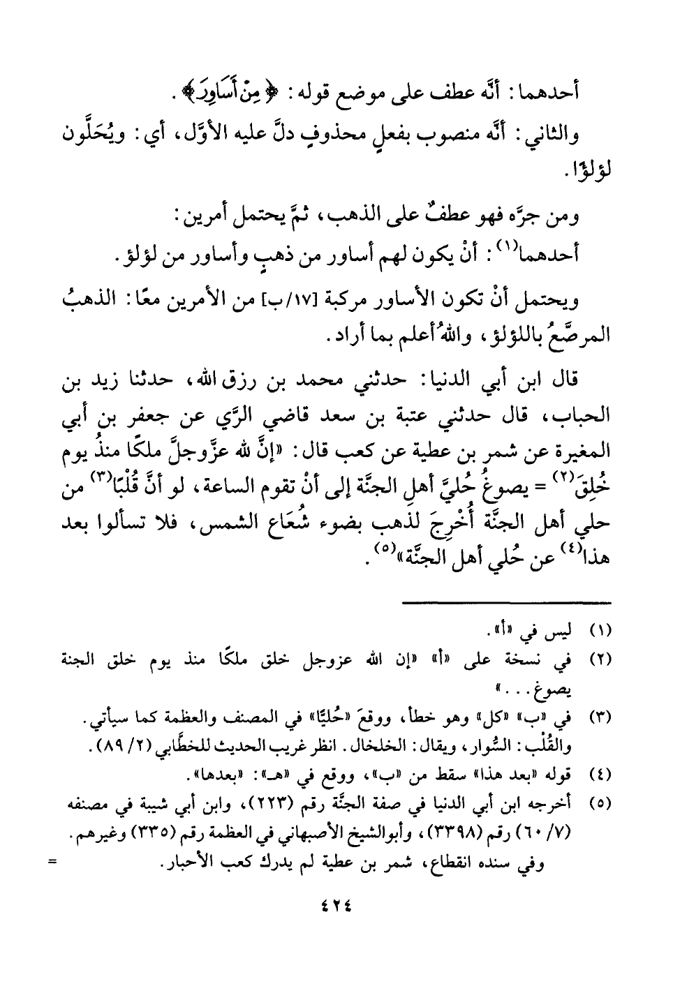 قال ابن أبي الدنيا: حدثني محمد بن رزق اللَّه، حدثنا زيد بن الحباب، قال حدثني عتبة بن سعد قاضي الرَّي عن جعفر بن أبي المغيرة عن شمر بن عطية عن كعب قال: "إنَّ للَّه عزَّ وجلَّ ملكًا منذُ يوم خُلِقَ (¬٢) = يصوغُ حُليَّ أهلِ الجنَّة إلى أنْ تقوم الساعة، لو أنَّ قُلْبًا (¬٣) من حلي أهل الجنَّة أُخْرِجَ لذهب بضوء شُعَاع الشمس، فلا تسألوا بعد هذا (¬٤) عن حُلي أهل الجنَّة" (¬٥) .