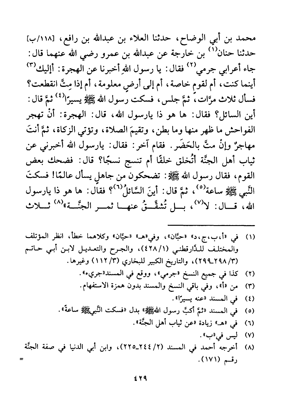 محمد بن أبي الوضاح، حدثنا العلاء بن عبد اللَّه بن رافع، حدثنا حنان (¬١) بن خارجة عن عبد اللَّه بن عمرو رضي اللَّه عنهما قال: جاء أعرابي جرمي (¬٢) فقال: يا رسول اللَّهِ أخبرنا عن الهجرة: أإليك (¬٣) أينما كنت، أم لقومٍ خاصة، أم إلى أرضٍ معلومة، أم إذا مِتَّ انقطعت؟ فسأل ثلاث مرَّات، ثمَّ جلس، فسكت رسول اللَّه -صلى اللَّه عليه وسلم- يسيرًا (¬٤) ثمَّ قال: أين السائل؟ فقال: ها هو ذا يا رسول اللَّه، قال: الهجرة: أنْ تهجر الفواحش ما ظهر منها وما بطن، وتقيمَ الصلاة، وتؤتي الزكاة، ثمَّ أنتَ مهاجرٌ وإنْ متَّ بالحَضَر. فقام آخر: فقال: يا رسول اللَّه أخبرني عن ثياب أهل الجنَّة أتُخلق خلقًا أم تنسج نسجًا؟ قال: فضحك بعض القوم، فقال رسول اللَّه -صلى اللَّه عليه وسلم-: تضحكون من جاهلٍ يسأل عالمًا! فسكتَ النَّبي -صلى اللَّه عليه وسلم- ساعة (¬٥) ، ثمَّ قال: أينَ السَّائلُ (¬٦) ؟ فقال: ها هو ذا يا رسول اللَّه، قال: لا (¬٧) ، بل تُشقَّقُ عنها ثمر الجنَّة" (¬٨) ثلاث