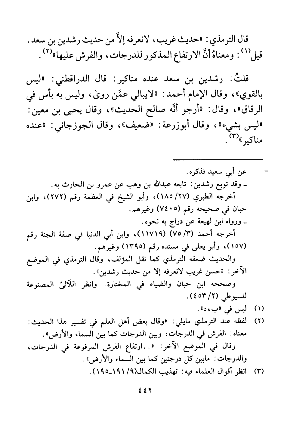 (¬٢) لفظه عند الترمذي ما يلي: "وقال بعض أهل العلم في تفسير هذا الحديث: معناه: الفرش في الدرجات، وبين الدرجات كما بين السماء والأرض".