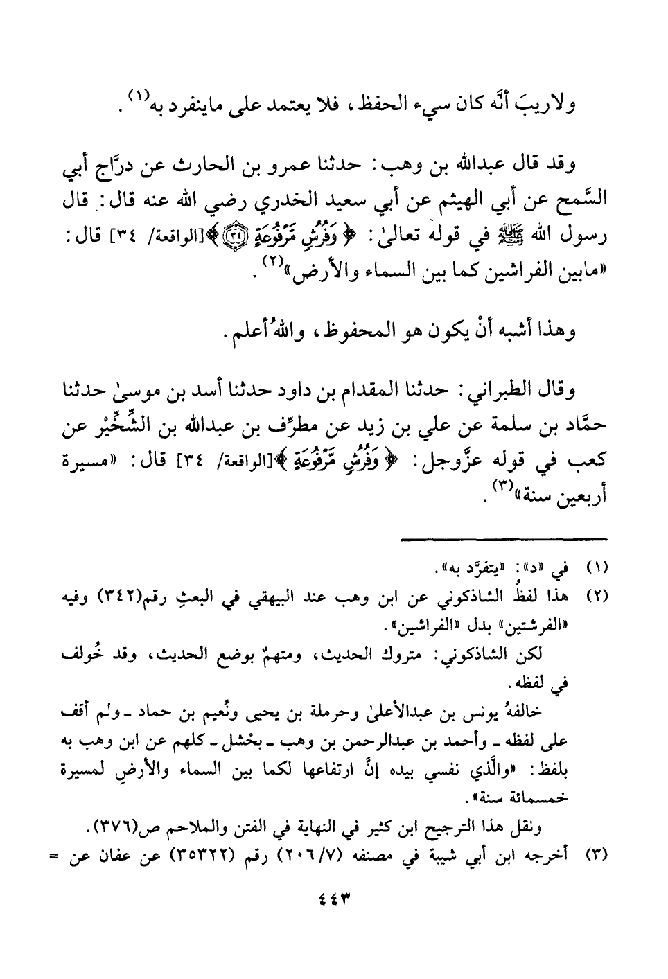 وقد قال عبد اللَّه بن وهب: حدثنا عمرو بن الحارث عن درَّاج أبي السَّمح عن أبي الهيثم عن أبي سعيد الخدري رضي اللَّه عنه قال: قال رسول اللَّه -صلى اللَّه عليه وسلم- في قوله تعالى: {وَفُرُشٍ مَرْفُوعَةٍ (٣٤) } [الواقعة: ٣٤] قال: "ما بين الفراشين كما بين السماء والأرض" (¬٢) .