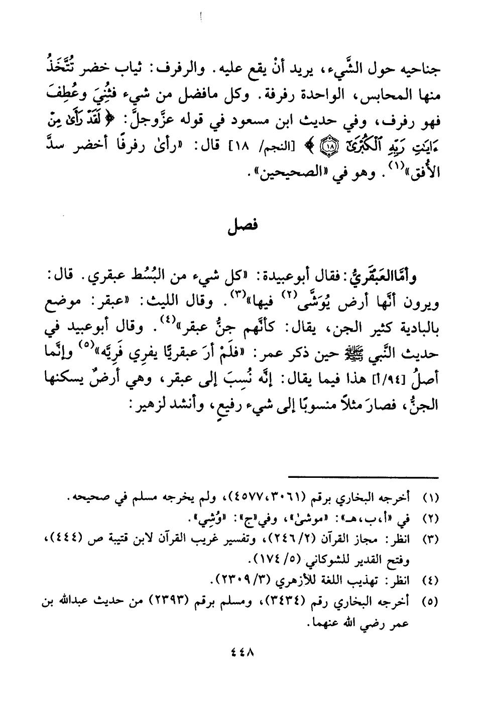 وأمَّا العَبْقَريُّ: فقال أبو عبيدة: "كل شيء من البُسُط عبقري. قال: ويرون أنَّها أرض يُوَشَّى (¬٢) فيها" (¬٣). وقال الليث: "عبقر: موضع بالبادية كثير الجن، يقال: كأنَّهم جنُّ عبقر" (¬٤). وقال أبو عبيد في حديث النَّبي -صلى اللَّه عليه وسلم- حين ذكر عمر: "فلَمْ أرَ عبقريًّا يفرِي فَرِيَّه" (¬٥) وإنَّما أصلُ هذا فيما يقال: إنَّه نُسِبَ إلى عبقر، وهي أرضٌ يسكنها الجنُّ، فصارَ مثلًا منسوبًا إلى شيء رفيعٍ، وأنشد لزهير: