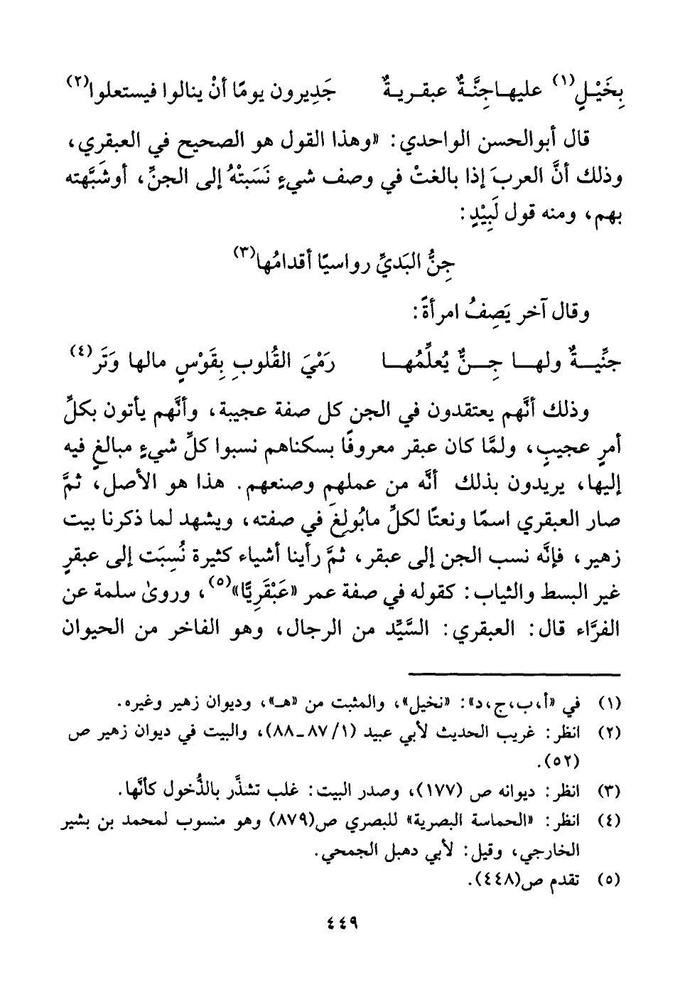 وذلك أنَّهم يعتقدون في الجن كل صفة عجيبة، وأنَّهم يأتون بكلِّ أمرٍ عجيبٍ، ولمَّا كان عبقر معروفًا بسكناهم نسبوا كلِّ شيءٍ مبالغٍ فيه إليها، يريدون بذلك أنَّه من عملهم وصنعهم. هذا هو الأصل، ثمَّ صار العبقري اسمًا ونعتًا لكلِّ ما بُولِغَ في صفته، ويشهد لما ذكرنا بيت زهير، فإنَّه نسب الجن إلى عبقر، ثمَّ رأينا أشياء كثيرة نُسِبَت إلى عبقرٍ غير البسط والثياب: كقوله في صفة عمر "عَبْقَرِيًّا" (¬٥) ، وروى سلمة عن الفرَّاء قال: العبقري: السَّيِّد من الرجال، وهو الفاخر من الحيوان
