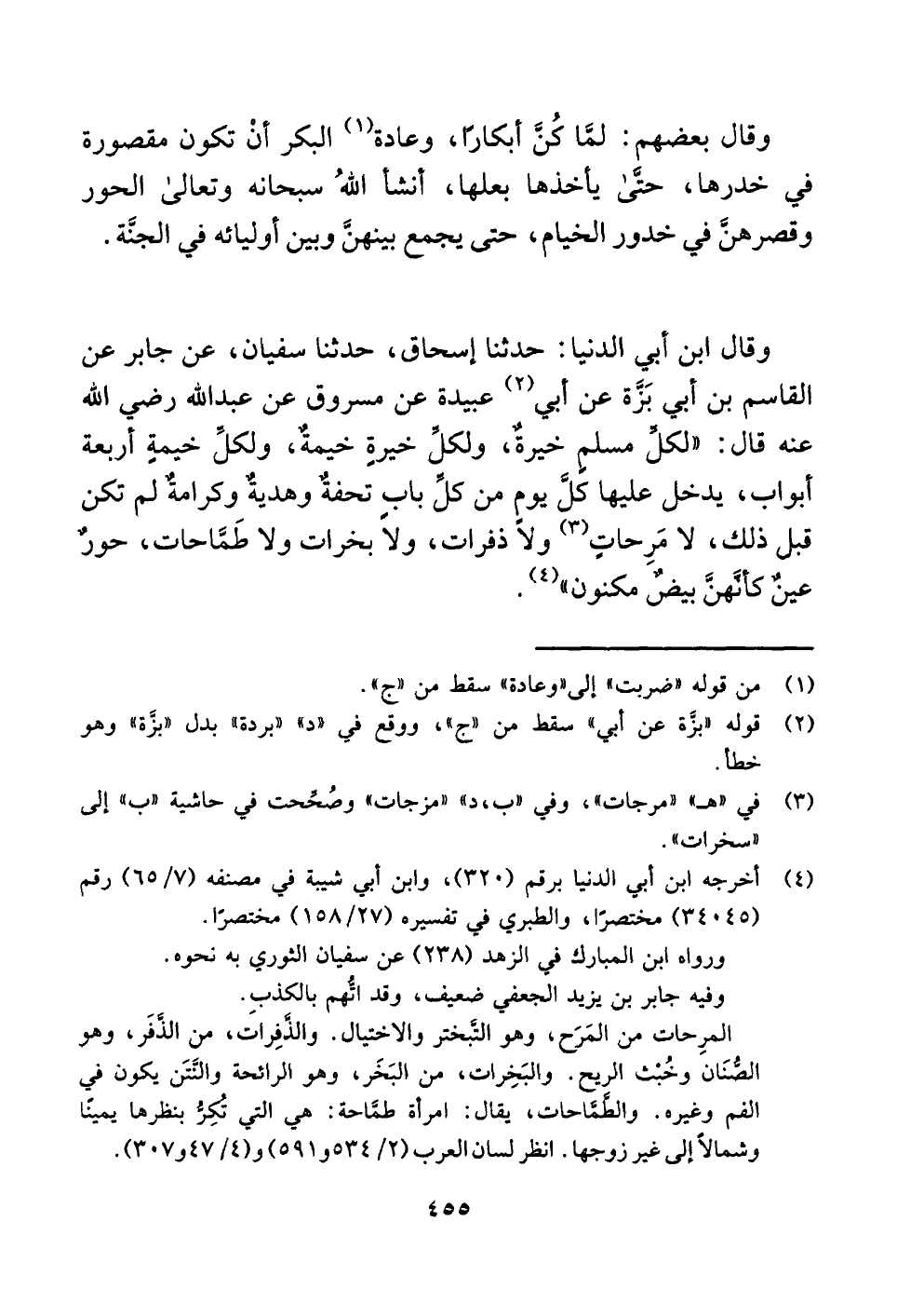 وقال ابن أبي الدنيا: حدثنا إسحاق، حدثنا سفيان، عن جابر عن القاسم بن أبي بَزَّة عن أبي (¬٢) عبيدة عن مسروق عن عبد اللَّه رضي اللَّه عنه قال: "لكلِّ مسلمٍ خيرةٌ، ولكلِّ خيرةٍ خيمةٌ، ولكلِّ خيمةٍ أربعة أبواب، يدخل عليها كلَّ يومٍ من كلِّ بابٍ تحفةٌ وهديةٌ وكرامةٌ لم تكن قبل ذلك، لا مَرِحاتٍ (¬٣) ولا ذفرات، ولا بخرات ولا طَمَّاحات، حورٌ عينٌ كأنَّهنَّ بيضٌ مكنون" (¬٤) .