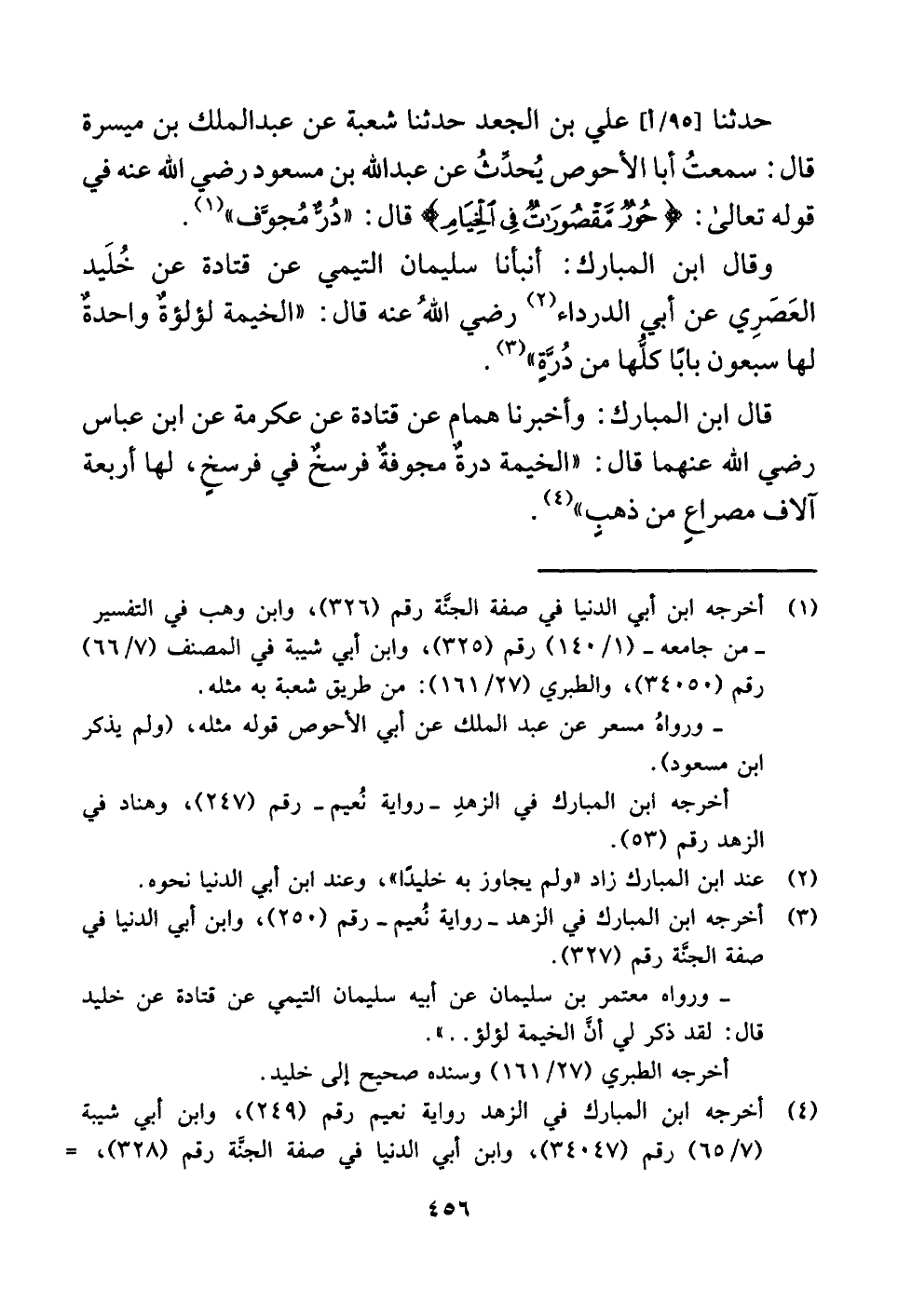 - ورواه معتمر بن سليمان عن أبيه سليمان التيمي عن قتادة عن خليد قال: لقد ذكر لي أنَّ الخيمة لؤلؤ. . ".