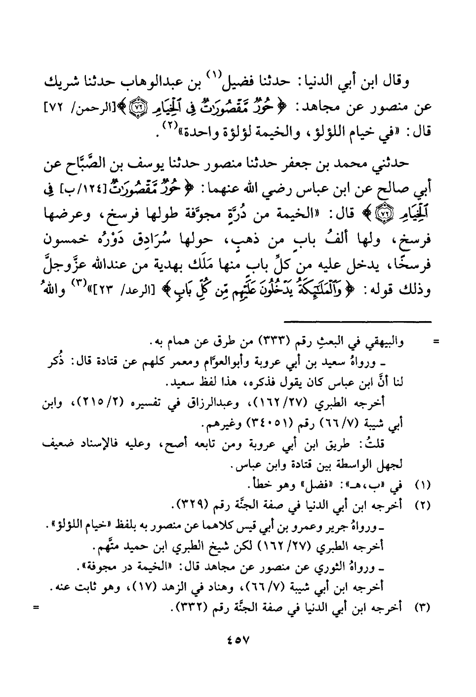 حدثني محمد بن جعفر حدثنا منصور حدثنا يوسف بن الصَّبَّاح عن أبي صالح عن ابن عباس رضي اللَّه عنهما: {حُورٌ مَقْصُورَاتٌ [١٢٤/ ب] فِي الْخِيَامِ (٧٢) } قال: "الخيمة من دُرَّةٍ مجوَّفة طولها فرسخ، وعرضها فرسخ، ولها ألفُ بابٍ من ذهبٍ، حولها سُرَادِق دَوْرُه خمسون فرسخًا، يدخل عليه من كلَّ بابٍ منها مَلَك بهدية من عند اللَّه عزَّ وجلَّ وذلك قوله: {وَالْمَلَائِكَةُ يَدْخُلُونَ عَلَيْهِمْ مِنْ كُلِّ بَابٍ} [الرعد: ٢٣] " (¬٣) واللَّهُ