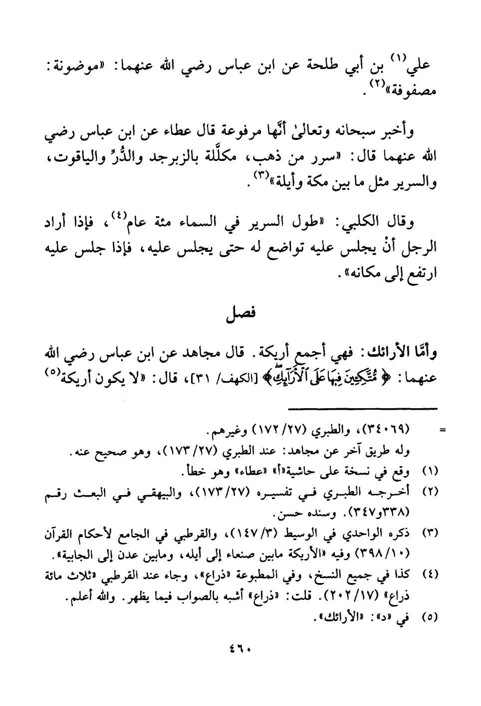 وأمَّا الأرائك: فهي أجمع أريكة. قال مجاهد عن ابن عباس رضي اللَّه عنهما: {مُتَّكِئِينَ فِيهَا عَلَى الْأَرَائِكِ} [الكهف: ٣١]، قال: "لا يكون أريكة (¬٥)