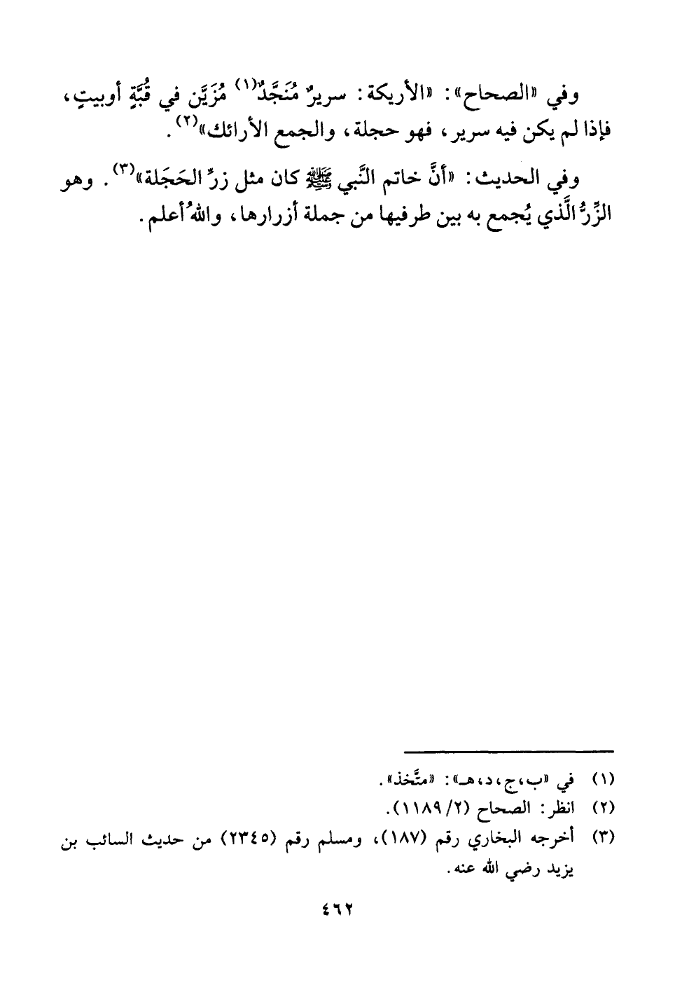 وفي "الصحاح": "الأريكة: سريرٌ مُنَجَّدٌ (¬١) مُزَيَّن في قُبَّةٍ أو بيتٍ، فإذا لم يكن فيه سرير، فهو حجلة، والجمع الأرائك" (¬٢) .
