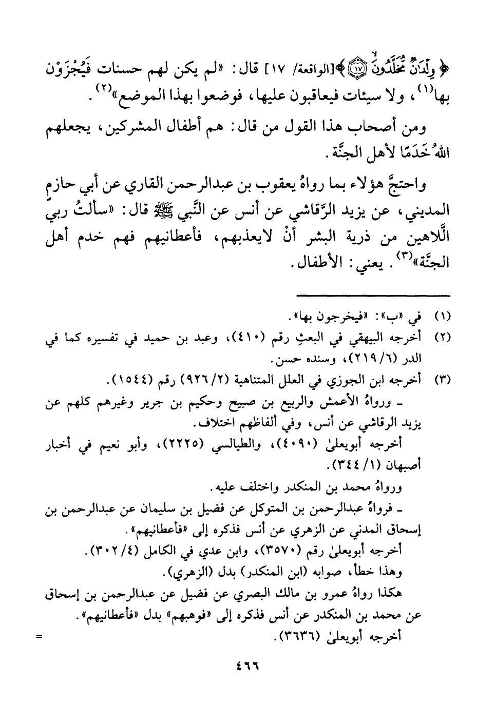 واحتجَّ هؤلاء بما رواهُ يعقوب بن عبد الرحمن القاري عن أبي حازمٍ المديني، عن يزيد الرَّقاشي عن أنس عن النَّبي -صلى اللَّه عليه وسلم- قال: "سألتُ ربي الَّلاهين من ذرية البشر أنْ لا يعذبهم، فأعطانيهم فهم خدم أهل الجنَّة" (¬٣) . يعني: الأطفال.