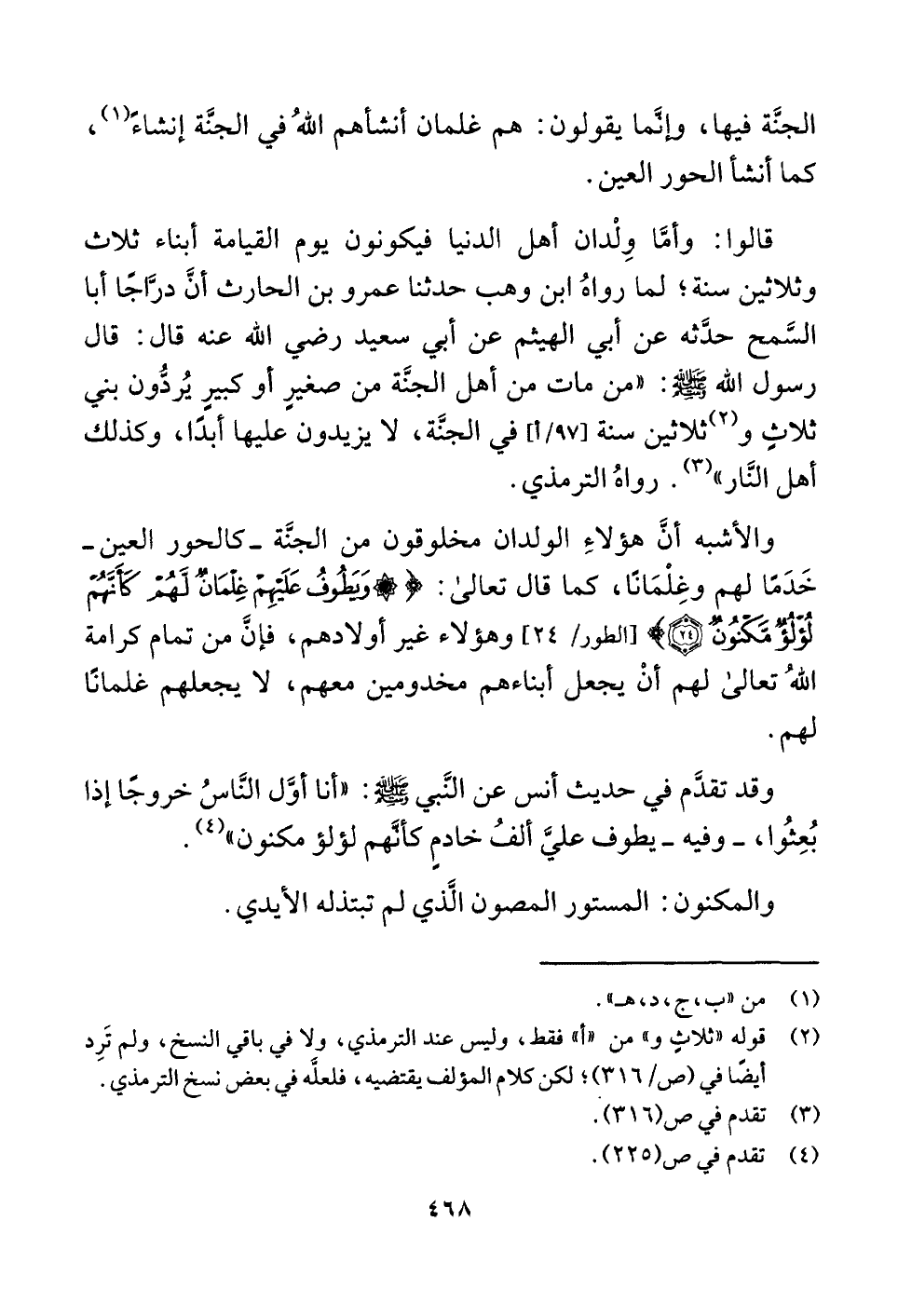 قالوا: وأمَّا وِلْدان أهل الدنيا فيكونون يوم القيامة أبناء ثلاث وثلاثين سنة؛ لما رواهُ ابن وهب حدثنا عمرو بن الحارث أنَّ درَّاجًا أبا السَّمح حدَّثه عن أبي الهيثم عن أبي سعيد رضي اللَّه عنه قال: قال رسول اللَّه -صلى اللَّه عليه وسلم-: "من مات من أهل الجنَّة من صغيرٍ أو كبيرٍ يُردُّون بني ثلاثٍ و (¬٢) ثلاثين سنة في الجنَّة، لا يزيدون عليها أبدًا، وكذلك أهل النَّار" (¬٣) . رواهُ الترمذي.