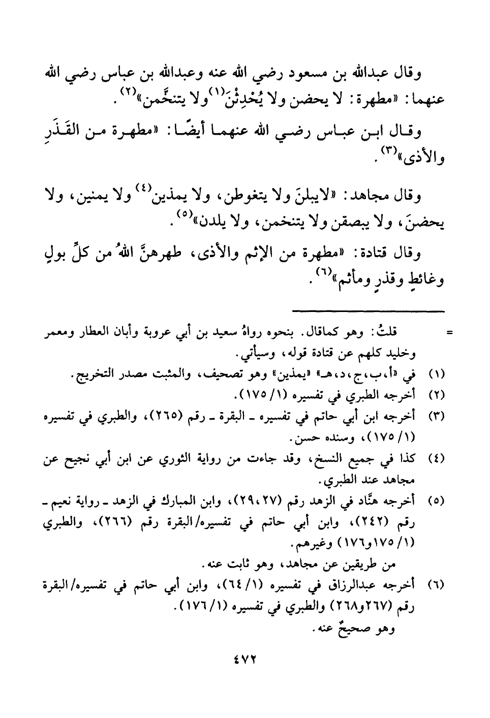 وقال عبد اللَّه بن مسعود رضي اللَّه عنه وعبد اللَّه بن عباس رضي اللَّه عنهما: "مطهرة: لا يحضن ولا يُحْدِثْنَ (¬١) ولا يتنخَّمن" (¬٢) .