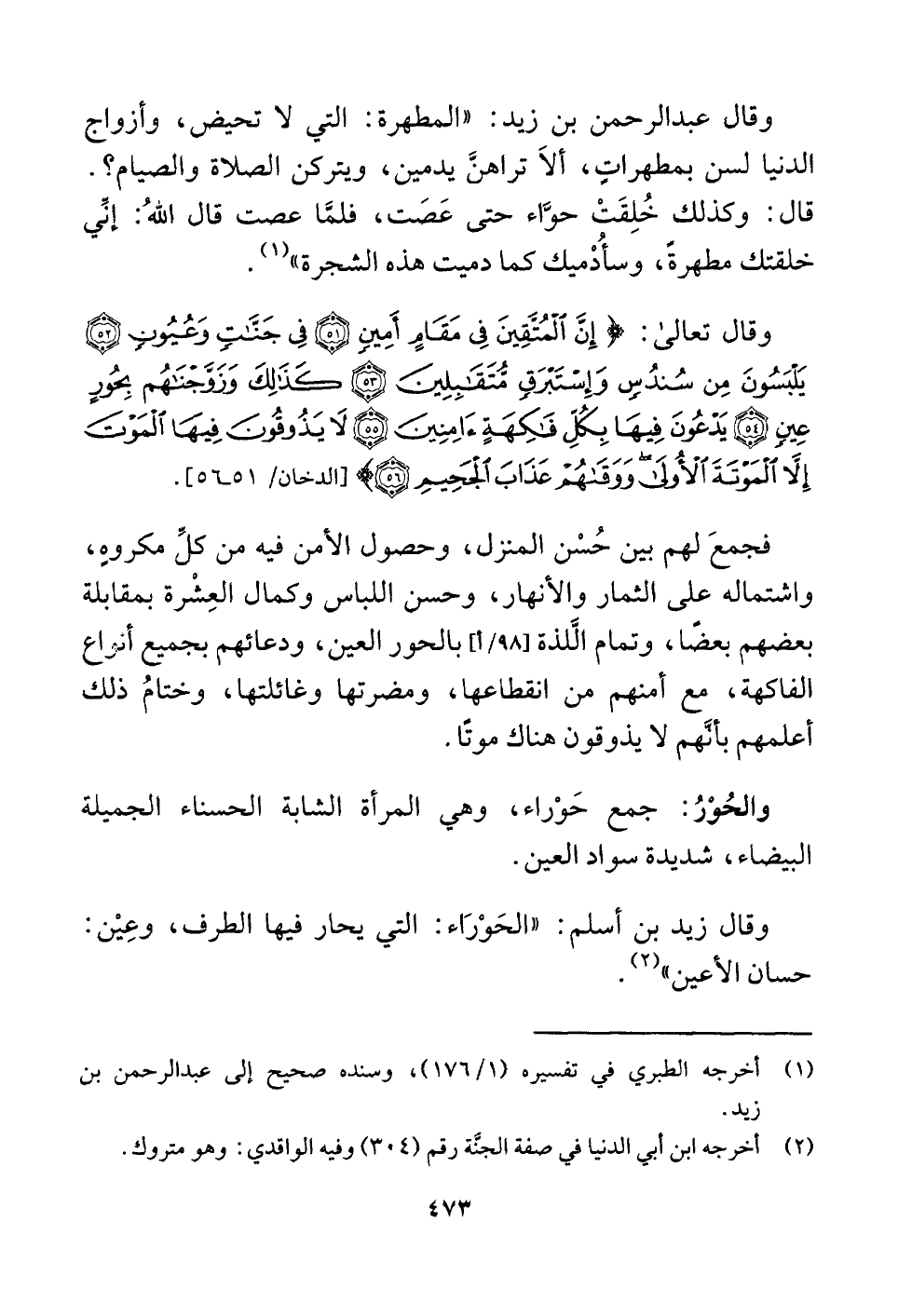 وقال زيد بن أسلم: "الحَوْرَاء: التي يحار فيها الطرف، وعِيْن: حسان الأعين" (¬٢) .