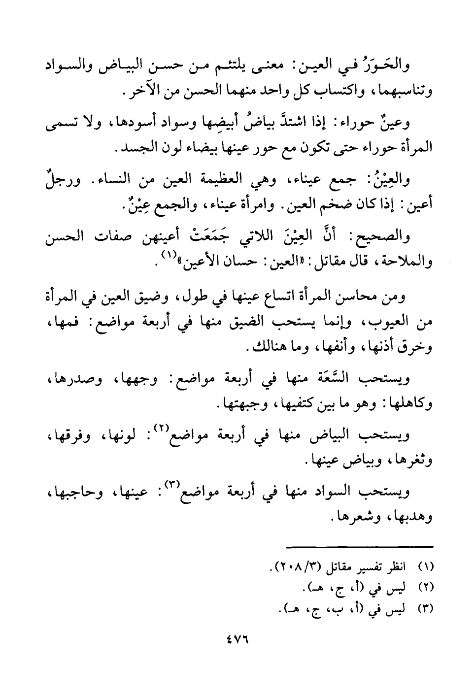 ومن محاسن المرأة اتساع عينها في طول، وضيق العين في المرأة من العيوب، وإنما يستحب الضيق منها في أربعة مواضع: فمها، وخرق أذنها، وأنفها، وما هنالك.