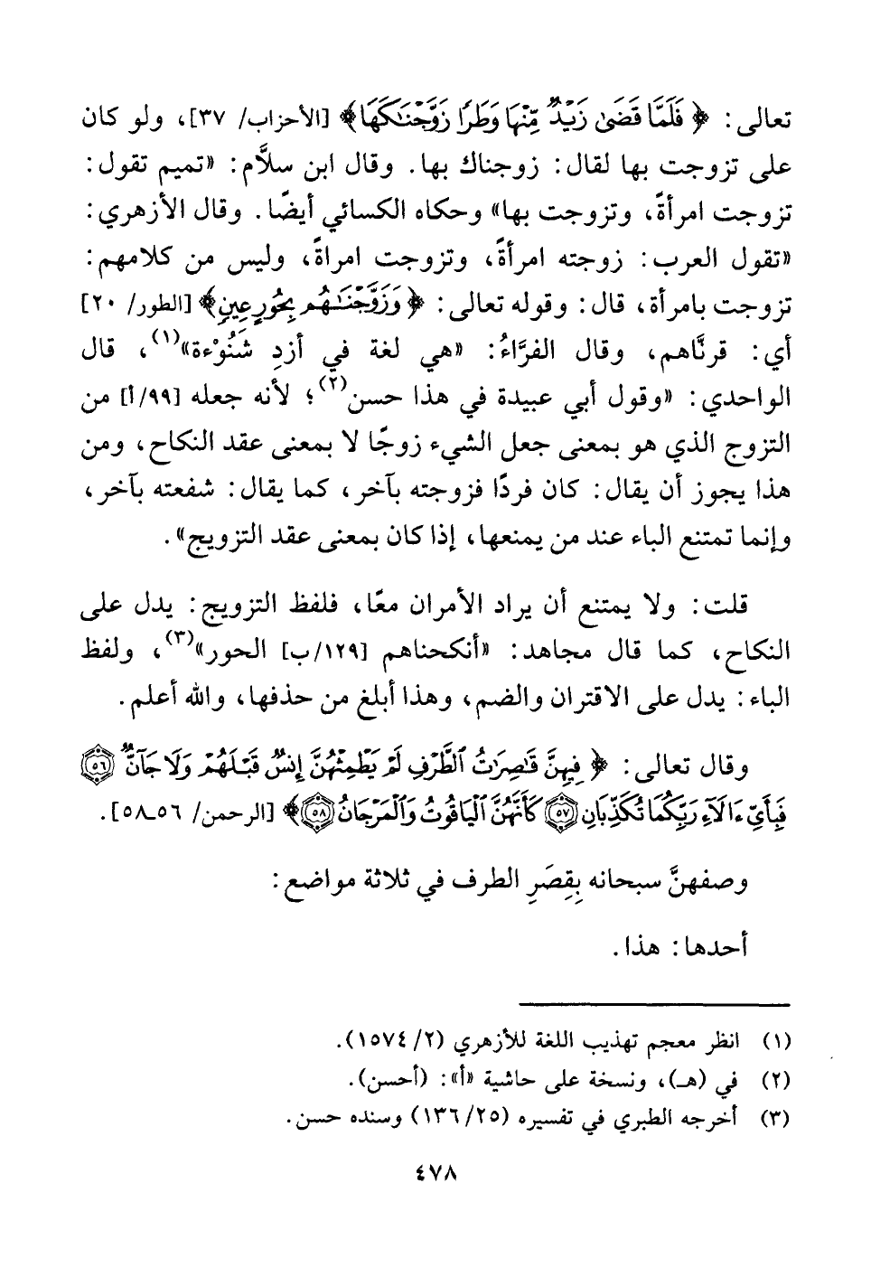 تعالى: {فَلَمَّا قَضَى زَيْدٌ مِنْهَا وَطَرًا زَوَّجْنَاكَهَا} [الأحزاب: ٣٧]، ولو كان على تزوجت بها لقال: زوجناك بها. وقال ابن سلَّام: "تميم تقول: تزوجت امرأةً، وتزوجت بها" وحكاه الكسائي أيضًا. وقال الأزهري: "تقول العرب: زوجته امرأةً، وتزوجت امراةً، وليس من كلامهم: تزوجت بامرأة، قال: وقوله تعالى: {وَزَوَّجْنَاهُمْ بِحُورٍ عِينٍ} [الطور: ٢٠] أي: قرنَّاهم، وقال الفرَّاءُ: "هي لغة في أزدِ شَنُوْءة" (¬١) ، قال الواحدي: "وقول أبي عبيدة في هذا حسن (¬٢) ؛ لأنه جعله من التزوج الذي هو بمعنى جعل الشيء زوجًا لا بمعنى عقد النكاح، ومن هذا يجوز أن يقال: كان فردًا فزوجته بآخر، كما يقال: شفعته بآخر، وإنما تمتنع الباء عند من يمنعها، إذا كان بمعنى عقد التزويج".