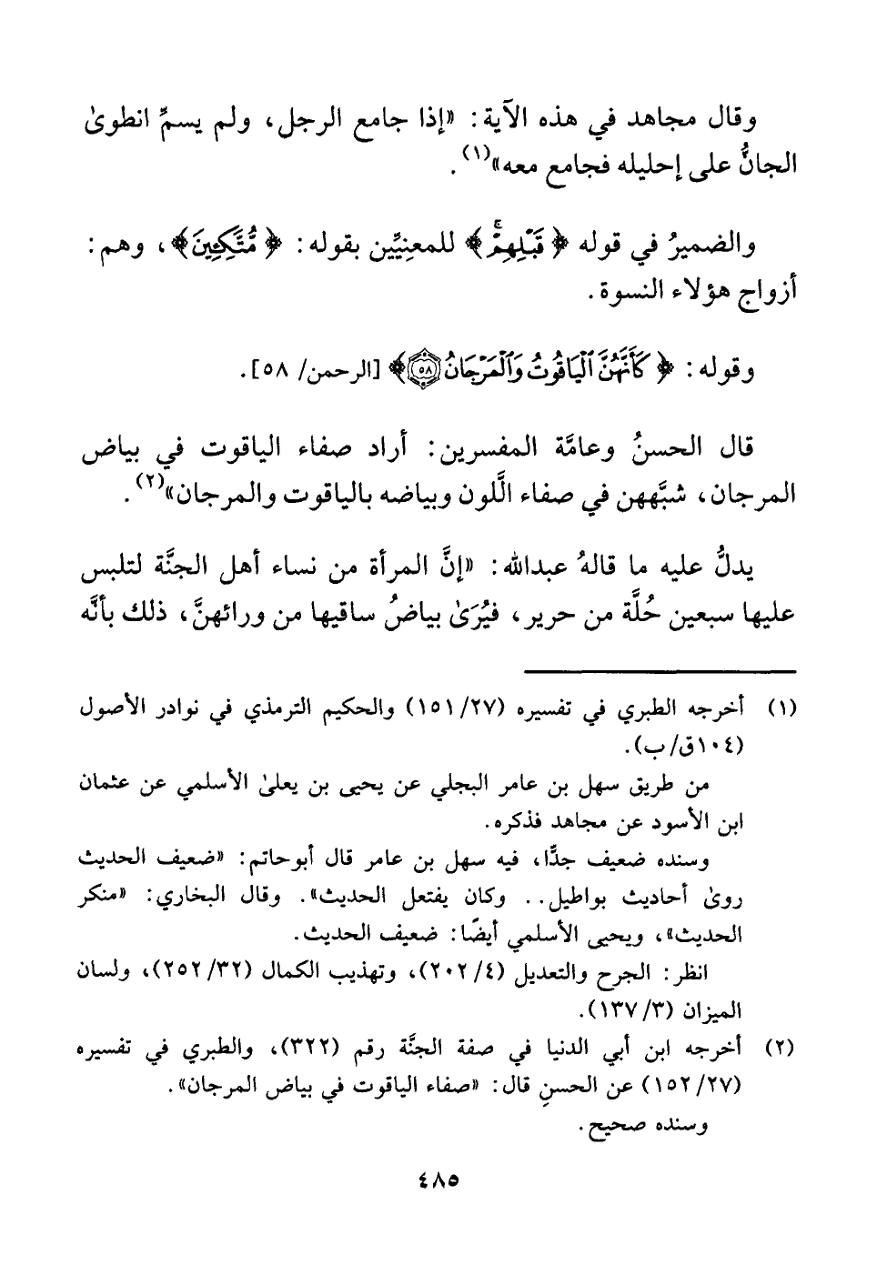(¬٢) أخرجه ابن أبي الدنيا في صفة الجنَّة رقم (٣٢٢)، والطبري في تفسيره (٢٧/ ١٥٢) عن الحسنِ قال: "صفاء الياقوت في بياض المرجان".