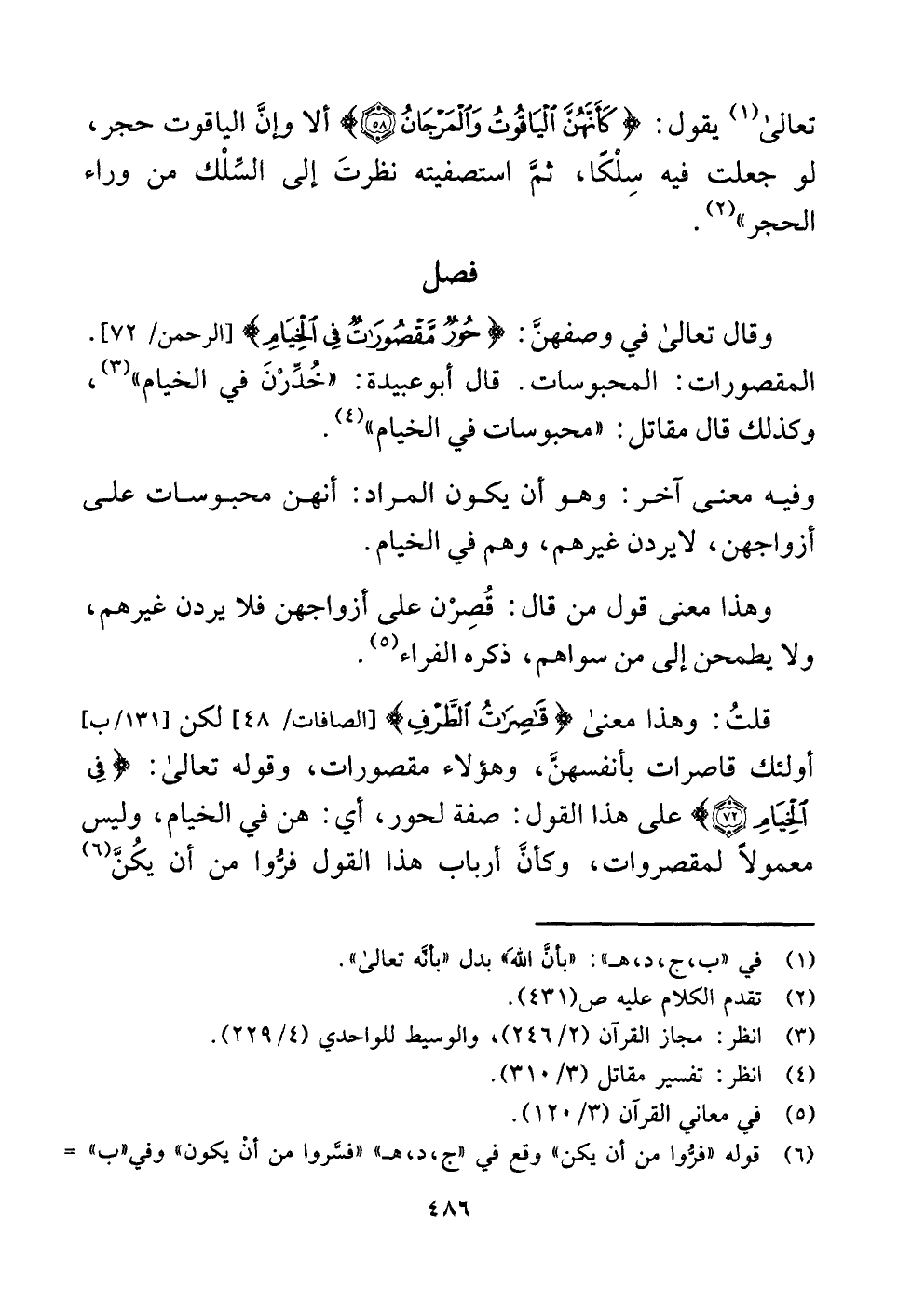 قلتُ: وهذا معنى {قَاصِرَاتُ الطَّرْفِ} [الصافات: ٤٨] لكن أولئك قاصرات بأنفسهن، وهؤلاء مقصورات، وقوله تعالى: {فِي الْخِيَامِ (٧٢)} على هذا القول: صفة لحور، أي: هن في الخيام، وليس معمولًا لمقصروات، وكأنَّ أرباب هذا القول فرُّوا من أن يكُنَّ (¬٦)
